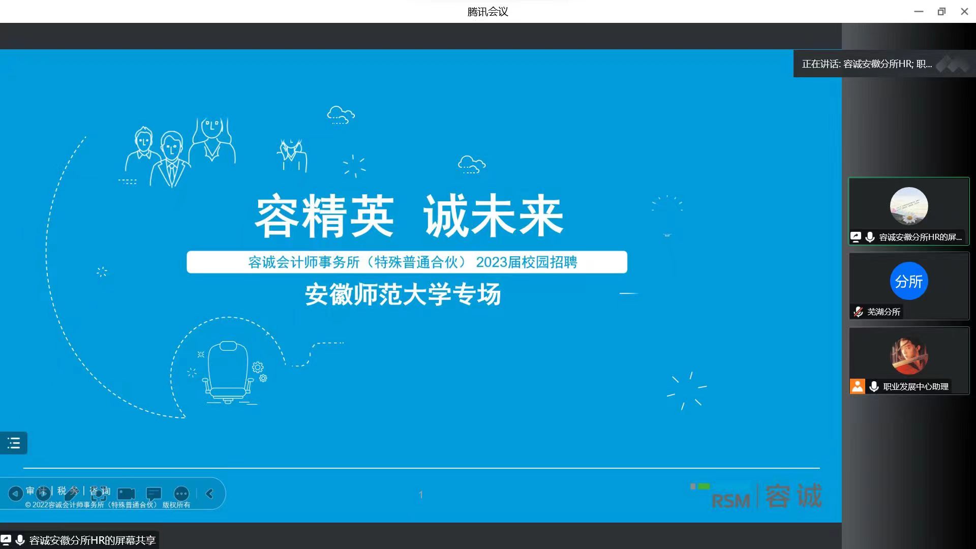 宣讲会伊始,容诚会计师事务所人事经理蔡梦佳以事务所在全国的布局、专家队伍、市场业务及业务增长四个方面为切入点向大家介绍了容诚事务所的发展概况、业务成绩及人才队伍,让同学们对事务所有了初步的认知和了解。接着,她向同学们介绍了会计师事务所的职业发展方向及行业趋势。她表示,容诚始终秉承“以质量求信誉,以信誉求发展”的办所宗旨,注重人文关怀,坚持为员工提供更多接触高端业务的机会。最后,她向大家介绍了其事务所的校招岗位及招聘流程,并向同学们发出诚挚邀请,鼓励大家积极参与容诚事务所的招聘。随后,芜湖苏宁易购人事经理唐伟通过一段视频影像向大家展示了其公司的工作环境和员工福利。他表示,苏宁易购致力于打造一个员工之间相互尊重、人人平等的工作环境。接着,唐伟结合“1200工程项目”详尽地向同学们介绍了公司的人才培养计划以及畅通的职位晋升通道。最后,唐伟向毕业生们介绍了公司的招聘岗位及招聘流程,并向同学们发出诚挚的邀请。