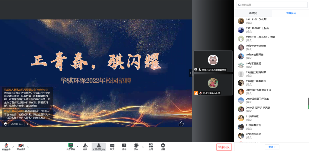 为进一步推进毕业生的就业工作,m88官网于11月2日在线上举办“经”彩有你2023届毕业生秋季线上招聘会,会议采取线上宣讲方式。参会的企业有安徽华骐环保科技(股票代码:300929)、冠亚国际物流集团、上海珍岛集团,公司部分2023届毕业生在线参加。