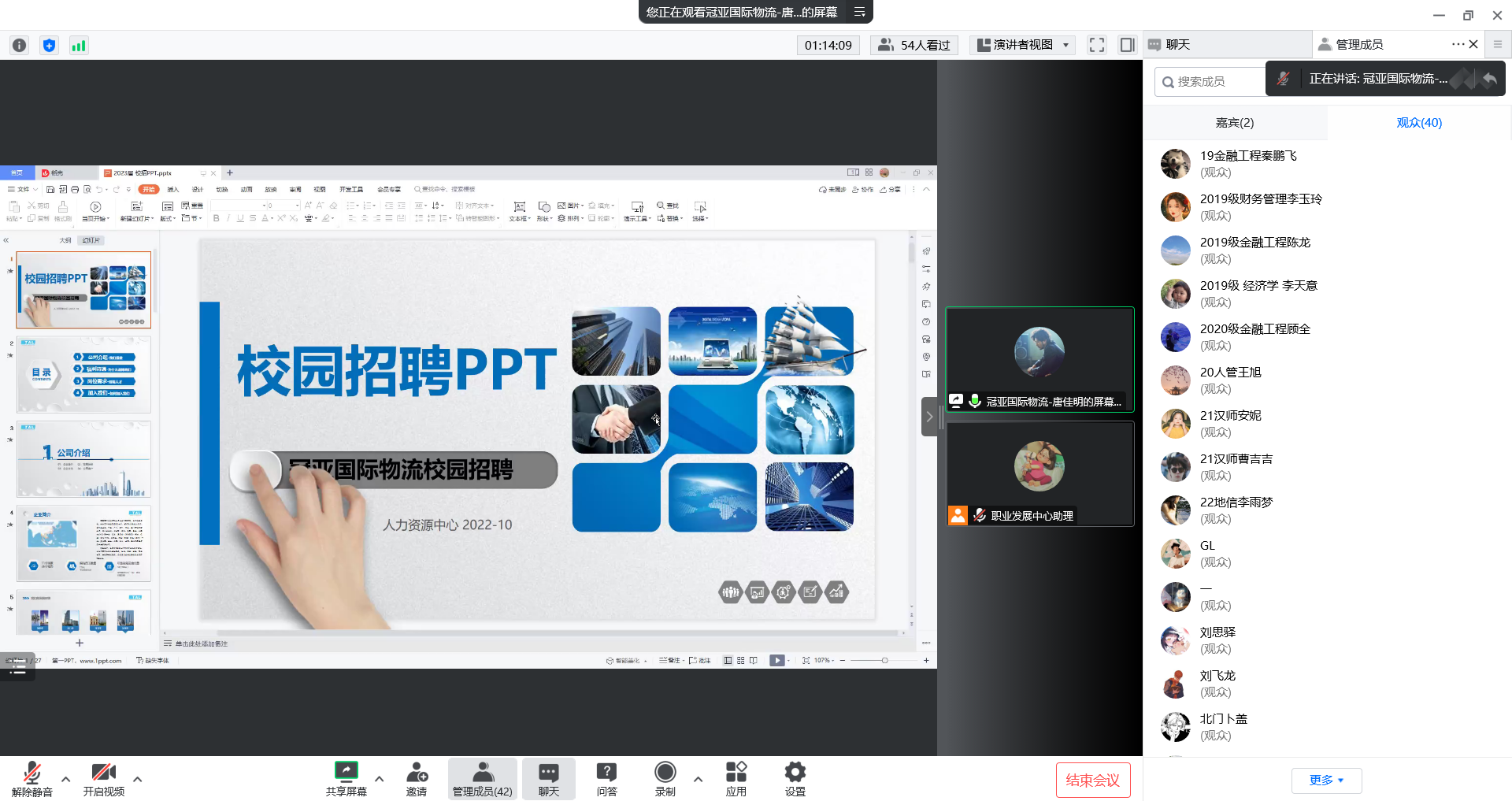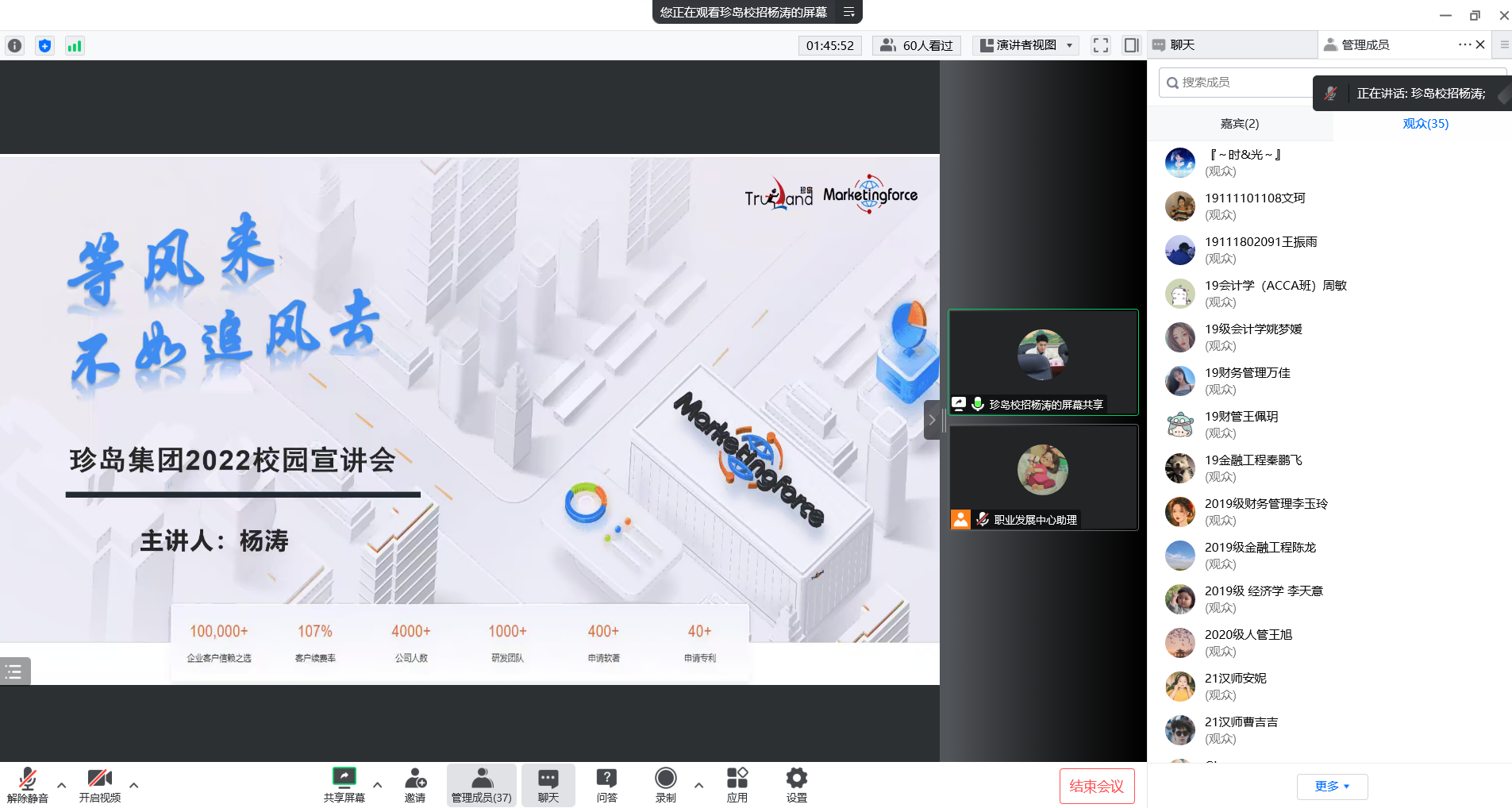 会议伊始,华骐环保负责人汤慜由马鞍山地理环境、生态环境、经济环境引入,对公司的业务定位、领先领域、合作交流及公司的规模等进行了介绍和说明。接着,她向同学们介绍了公司对于招聘毕业生的能力要求,详细说明了公司两种能力通道的晋升方式、招聘岗位以及业务技能学习培训的具体情况,并向同学们发出了真挚的邀请。冠亚国际物流负责人唐佳明首先展示了企业积极宏伟的文化,并从公司环境、薪酬福利、员工活动、职业发展等方面向同学们介绍了公司的福利待遇和岗位需求。最后,他结合同学们的提问进行了详细的说明,并向同学们发出邀请。珍岛集团负责人杨涛介绍了企业的业务板块,表示公司紧抓国家朝阳赛道政策,主要业务聚焦一站式服务企业数字化转型。他表示,作为开拓性企业,公司有着完善的人才体系搭建,同学们的晋升通道不会受到数量的限制,有良好的上升空间。最后,他向同学们介绍了企业的福利体系、企业文化等,并表示期待同学们的加入。