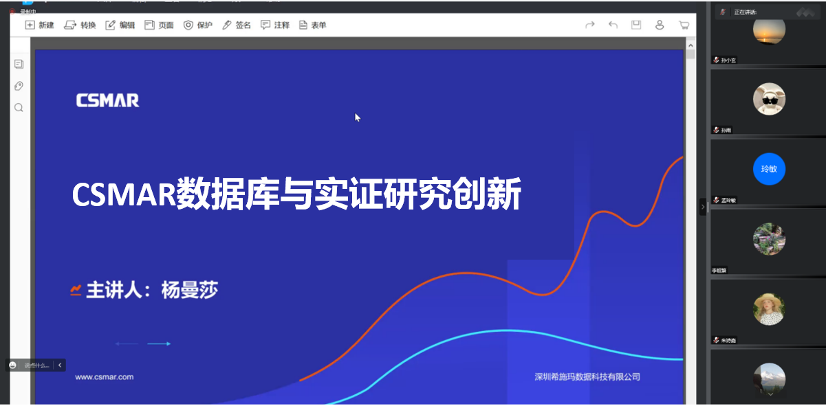 为了缓解老师们在教学和科研中的部分实证困惑,也为了配合最近陆续开展的本科和研究生毕业论文开题活动,12月8日下午,公司邀请深圳希施玛数据科技有限公司的高级研究员杨曼莎博士为公司师生在线举办了“CSMAR数据库与实证研究创新”专题讲座。讲座由钱瑞梅老师主持,公司相关专业的老师和金融专业的本硕同学一起在线收看。