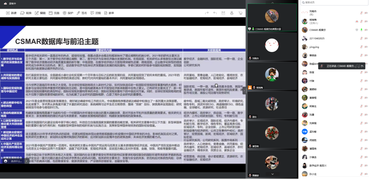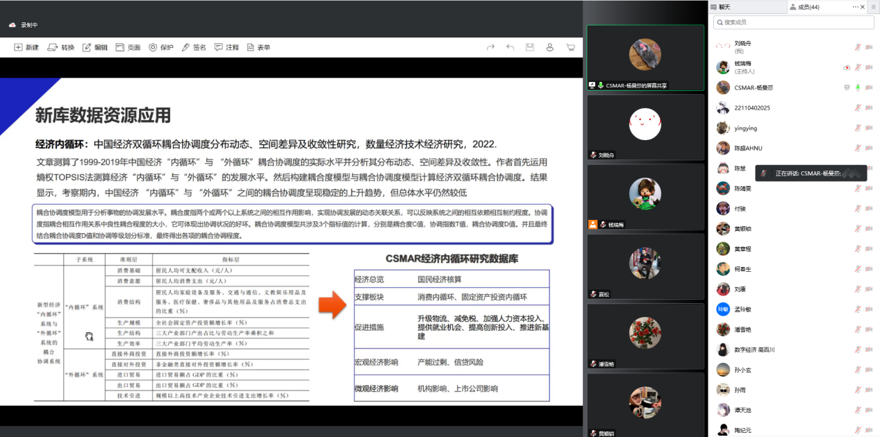 杨博士首先汇报了公司师生利用CSMAR数据库在CSSCI上发表学术论文的情况。围绕公司今年已经采购的新的数据子库,杨博士介绍了每个数据库系列下的子库信息、数据调取和检索方法,支持的研究领域以及实证研究的发展动态。针对老师们感兴趣的数字经济、碳金融等话题,杨博士还介绍了相关的数据库信息以及获取途径。