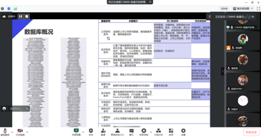 为了提高教学和科研质量,增强研究能力,12月7日下午,公司邀请深圳希施玛数据科技有限公司的技术工程师杨阳老师为公司师生举行了“CSMAR数据库&证券投资实训系统的操作与应用”专题讲座。本次讲座采取腾讯会议形式,讲座由金融系主任陈超老师主持,公司老师、部分研究生和本科生在线收看。