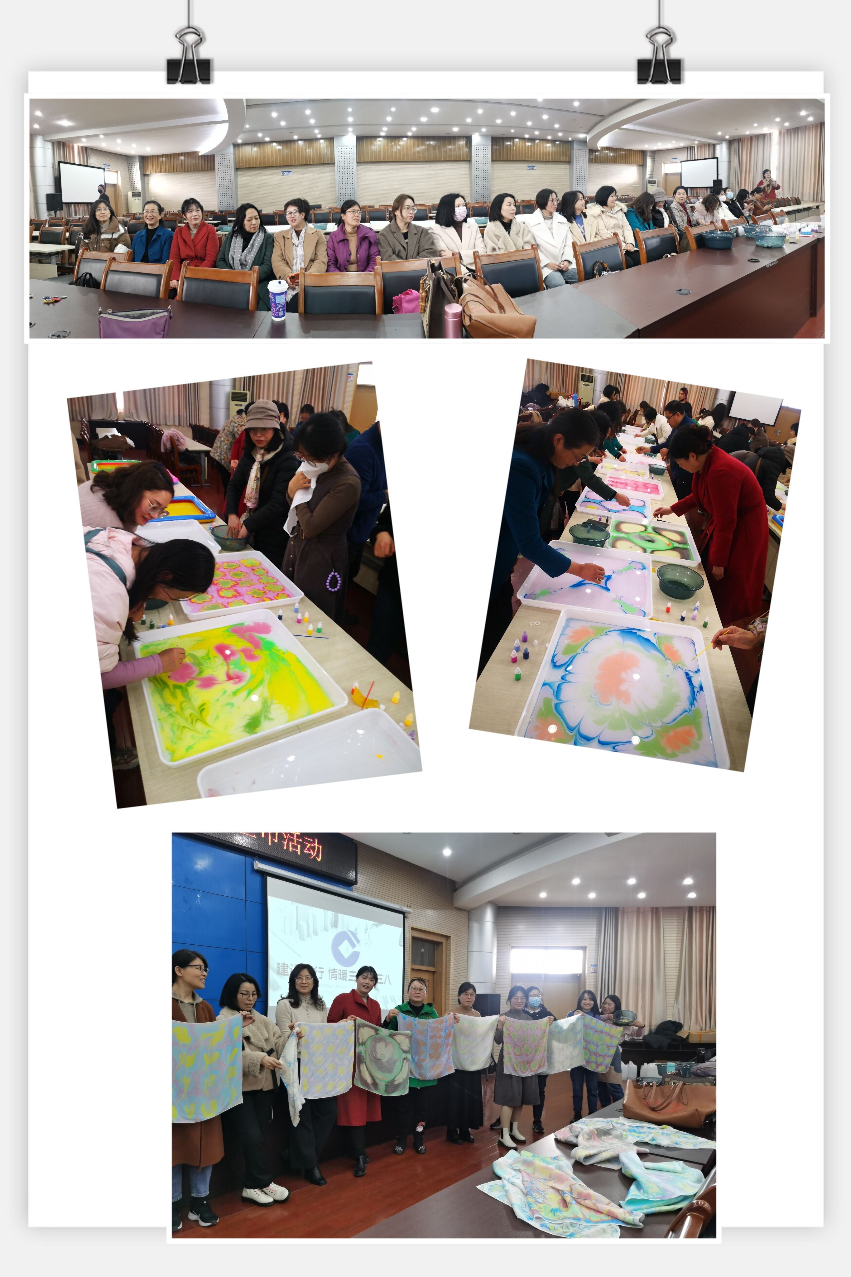 本网讯(孙雪霞/文 万寒生/图)今年是“三八”国际妇女节113周年,为纪念这一具有历史意义的节日,丰富公司女职工的业余文化生活,激励广大女职工以饱满的热情和最佳的状态在本职岗位上建功立业,公司分工会精心设计筹划,于3月1日下午组织全院女职工开展了一场以“水拓画丝巾,非遗指尖承”为主题的水拓丝巾DIY活动。活动得到女教职工的积极响应,大家踊跃参加,营造了欢快的节日氛围。