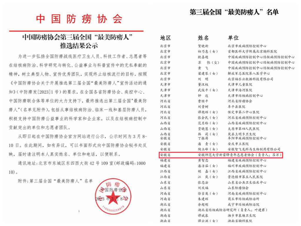 近日,2023年世界防治结核病日主题宣传活动在北京开展。世界卫生组织结核病/艾滋病防治亲善大使彭丽媛,国家卫生健康委副主任、国家疾控局局长王贺胜,民政部副部长柳拯,北京市委常委、宣传部部长莫高义,北京市委常委、副市长靳伟,共青团中央书记处书记徐晓参加。m88官网新雷锋青年志愿者协会作为第三届全国“最美防痨人”全国高校唯一入选集体受邀前往北京现场参加主题宣传活动。