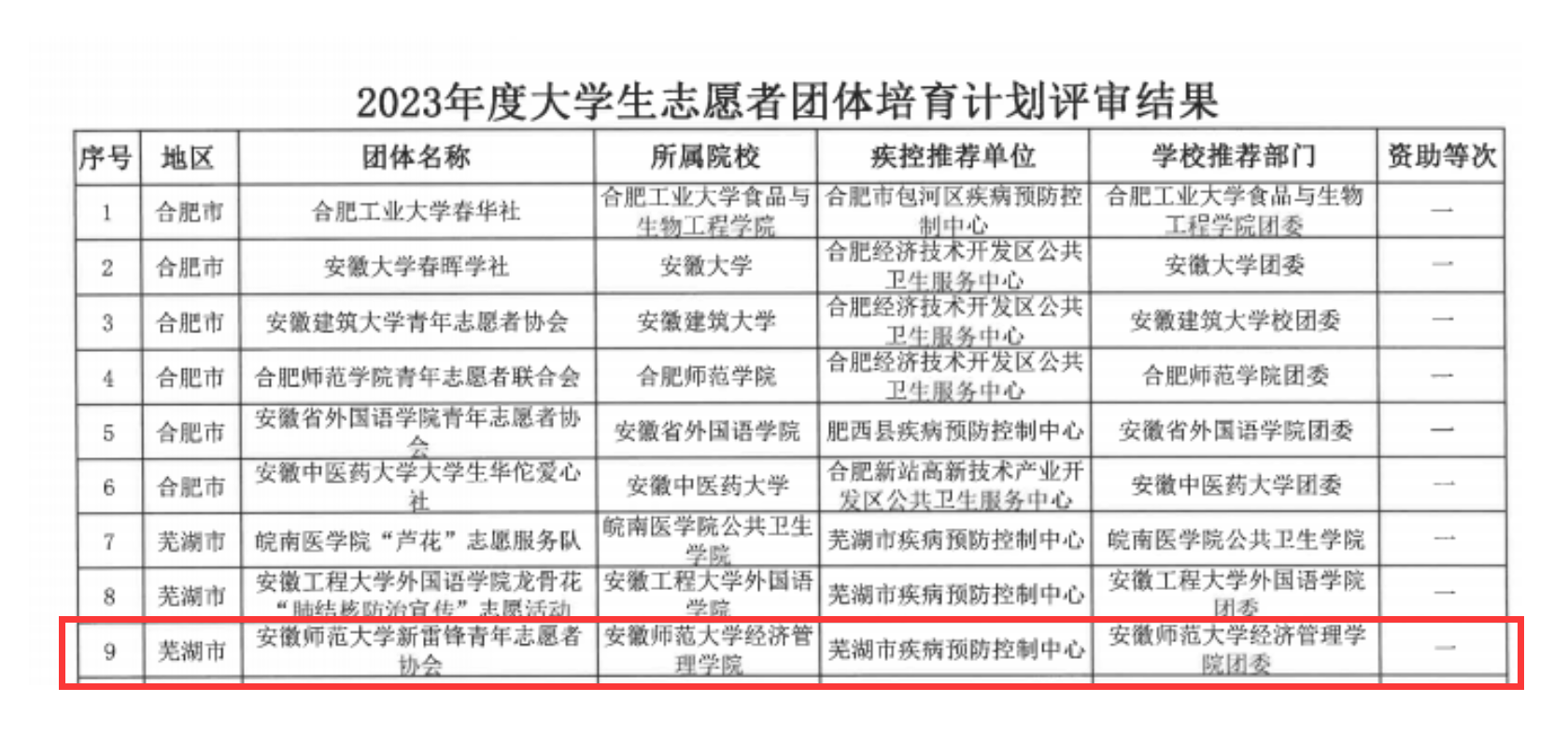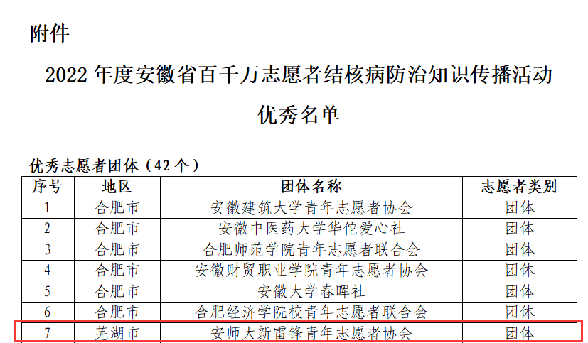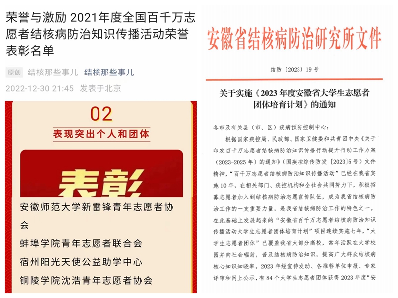 近日,中国疾病预防控制中心发布《2021年百千万志愿者结核病防治知识传播活动荣誉表彰名单》,公司m88官网新雷锋青年志愿者协会获国家百千万志愿者结核病防治知识传播活动2021年度优秀团体荣誉称号,并连续五年获安徽省百千万志愿者结核病防治知识传播活动一等资助奖励。