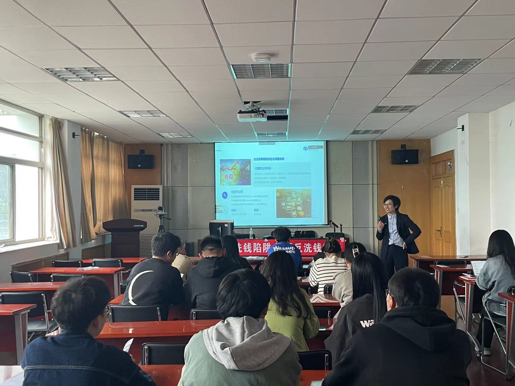 宣讲会上,东北证券上海分公司机构业务总监张虹从公司发展切入,以全国证券发展趋势为依托,详细介绍了东北证券公司的发展历程,展现了其布局广泛、多点覆盖、业务全面的特点。她着重介绍了公司完整的业务体系,针对各项业务进行了详细的解读。随后,她向同学们介绍了公司的招聘岗位、从业要求、员工发展晋升通道及福利待遇,并以自身的经历为例,向同学们分享了一名券商从业者的思考和感悟。同时他鼓励同学们要勇于挑战自我,在职场中,要积极调整自己从员工转为职场人的身份角色,在自己的的工作岗位上也要不断提升自我能力,夯实专业技能。最后,她向同学们解读了公司的应聘流程和要求,真诚地邀请同学们加入东北证券。