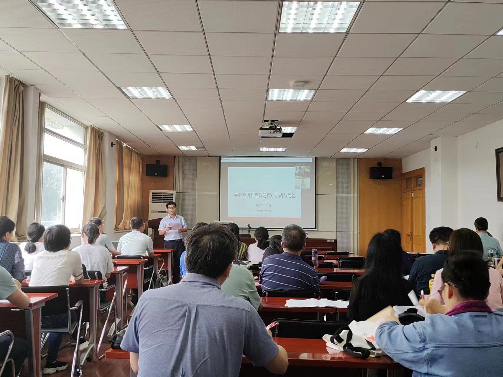 6月25日下午,马长伟主持了第二阶段的专题报告。国家教学成果奖二等奖、上海市教学成果特等奖获得者,上海市课程思政教学名师夏纪军教授分享了“经管类课程思政建设:挑战与经验”。夏纪军从课程思政建设的原则、理念入手,介绍了课程思政建设的思路与方案,分享了上海财经大学经济公司的建设经验。