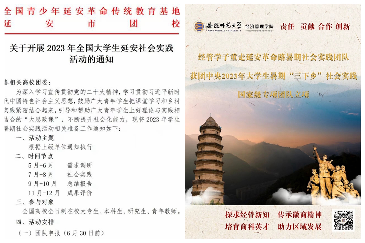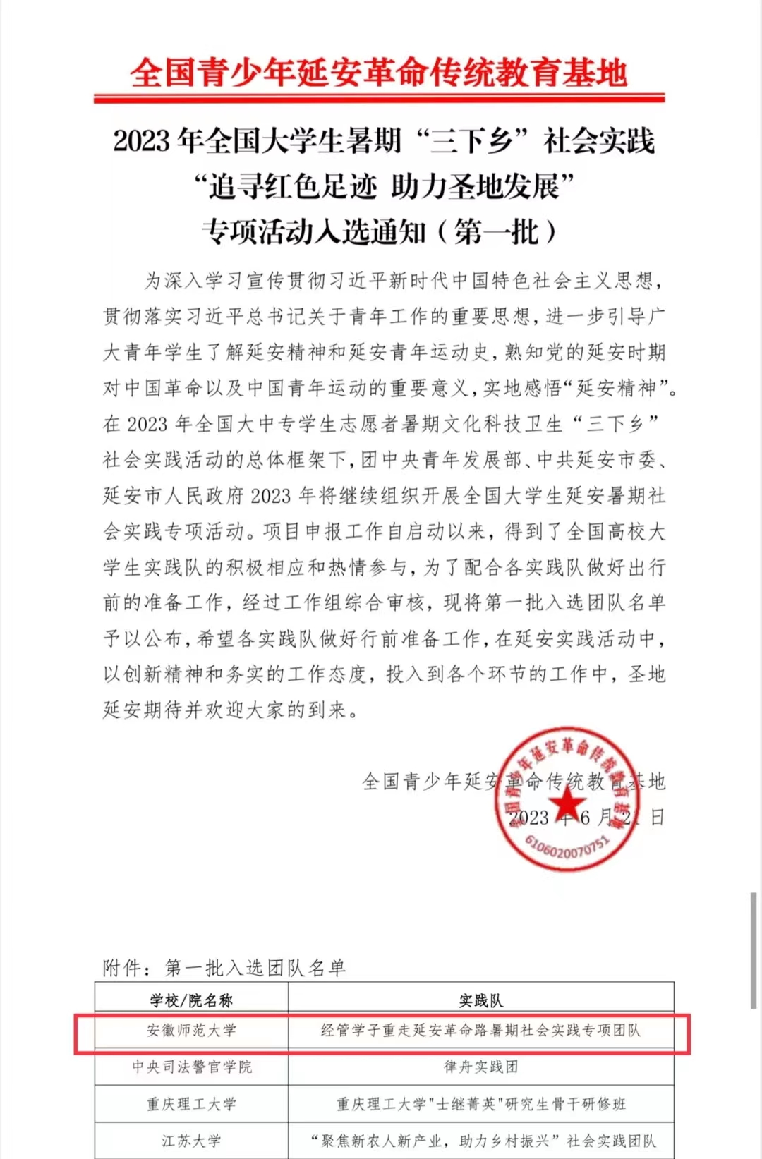 近日,团中央公布了2023年“追寻红色足迹·助力圣地发展”全国老员工暑期社会实践专项活动入选团队名单,公司m88官网申报的经管学子重走延安革命路暑期社会实践团队(调研课题为《“党建+”引领乡村振兴:新时代基层党建助力乡村振兴现状调研——以延安为例》)喜获立项。全国共有124支团队成功立项,安徽省高校仅3支队伍入选。