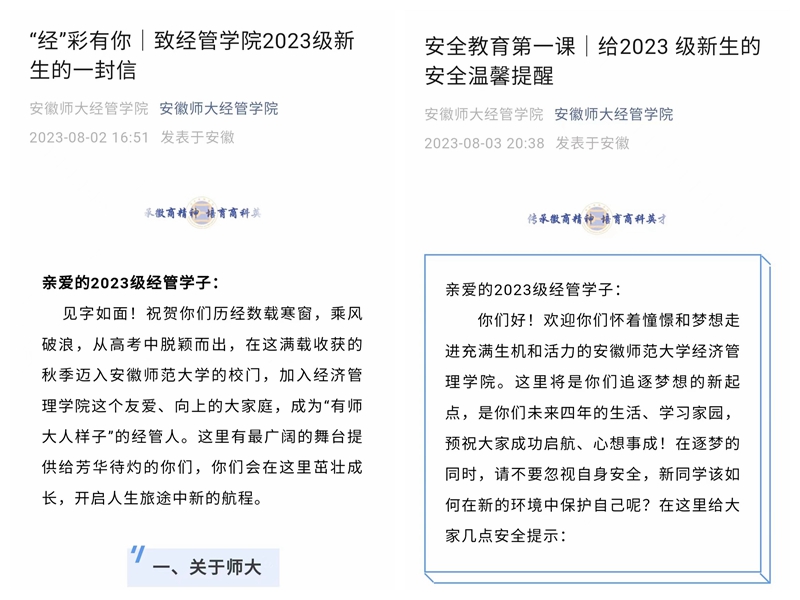 面向新生发布《“经”彩有你|致m88官网2023级新生的一封信》《安全教育第一课|给2023 级新生的安全温馨提醒》从校史校情、院史院情,给新生的暖心寄语、温馨安全提醒等内容帮助新生更好了解大学。建立公司2023级新生群,学团组织骨干与新生线上“键对键”交流,解答新生疑问和困惑。
