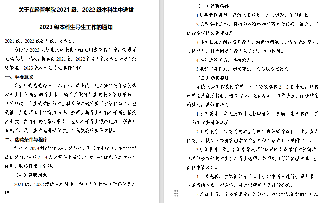 为做好2023级新生入学教育和新生朋辈教育工作,促进员工成人成才成功,公司面向2021级、2022级各年级各专业开展了“经管繁星”2023级本科生导生选聘工作,将依据专业特点,在员工行政班级内,按照2至3人设置导生岗位。