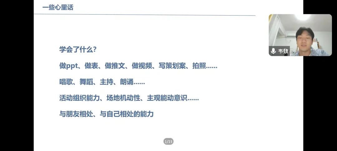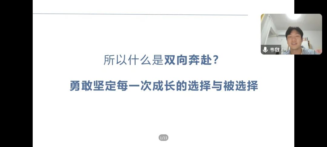 2023届金融工程专业毕业生韦魏以“勇敢坚定每一次成长的选择与被选择——基于我与员工组织的双向奔赴”为交流主题,展示了自己丰富多彩的老员工活和个人成长经历。希望新生勇敢奔赴,坚定每一次选择;感谢相遇,不负每一次的被选择,做一个勇敢且懂得感恩的人。“韦魏学长勇敢地坚定每一次成长的选择与被选择,在一次次挑战中,磨砺了自己的本领。学长的分享让我对即将而来的老员工活愈加期待,愿我们新生能够把握住宝贵的大学四年时光。”2023级经济学专业新生韦宇楠同学说。公司团委还将在新生入学前安排两期线上交流,通过邀请优秀毕业生线上专题交流分享助力新生成长发展。