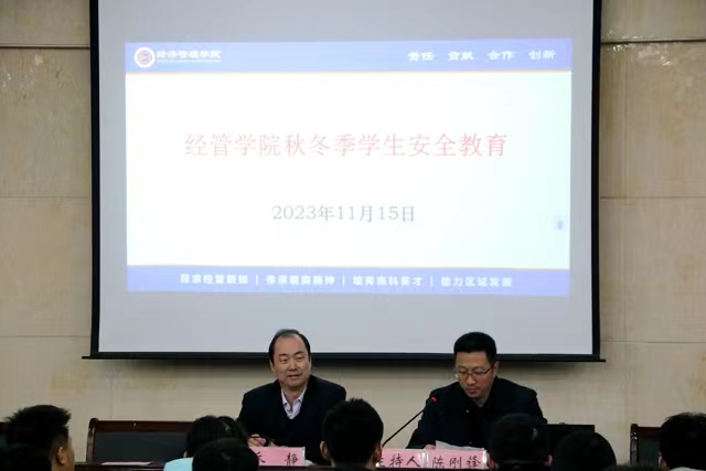 2023年11月15日晚,m88官网在原财务处二楼报告厅召开秋冬季员工安全教育会。公司党委书记乔静、党委副书记陈刚锋,全体本科生、研究生辅导员和各年级各专业班级班长、安全委员、寝室长代表参加。会议由陈刚锋主持。