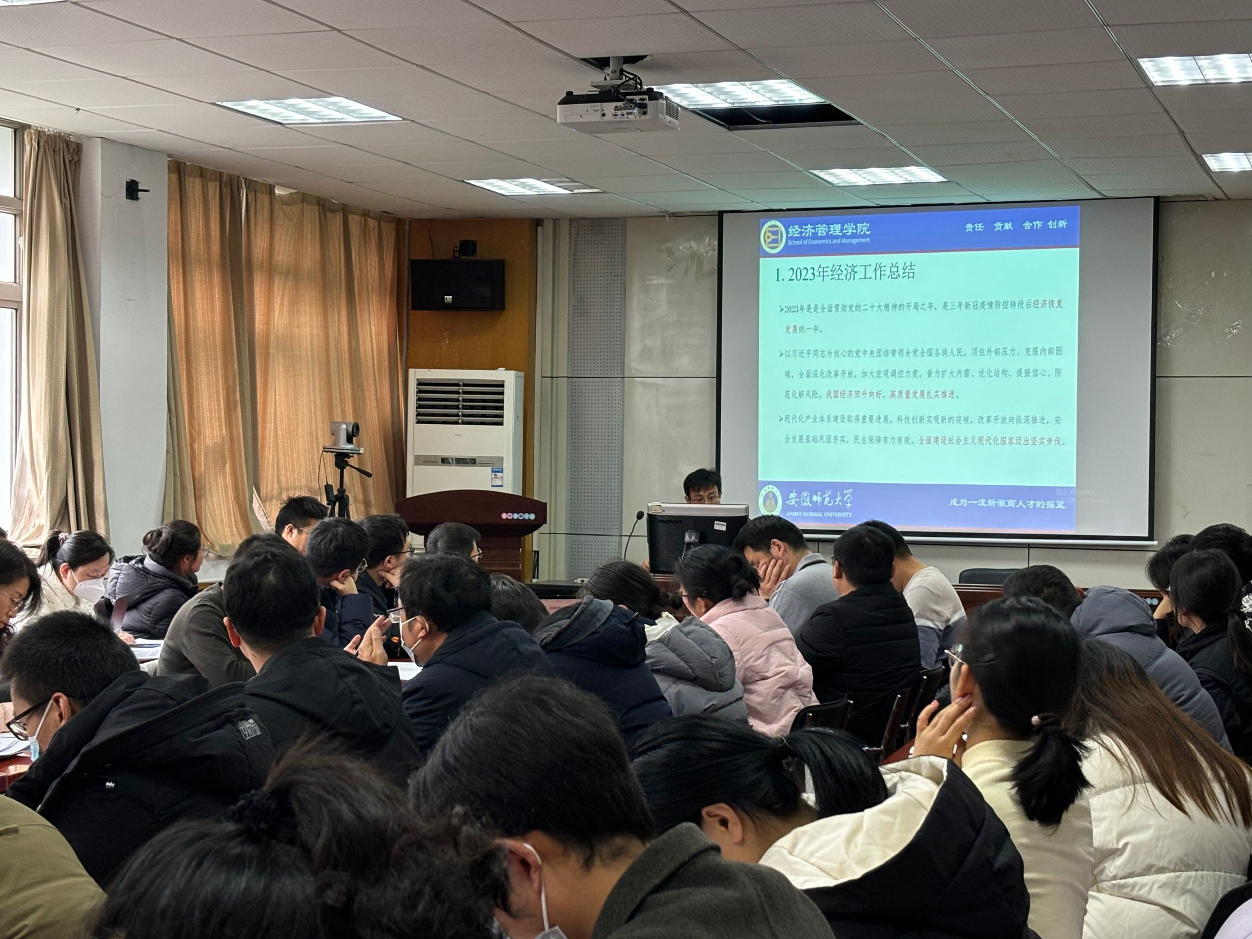 经济学教工党支部党员代表、“江淮文化名家”引育工程领军人才、经济系余吉祥教授围绕学习贯彻中央经济工作会议精神,从2023年经济工作总结、2024年经济工作思路与重点、结合工作如何落实中央经济工作会议精神等角度进行了专题辅导。