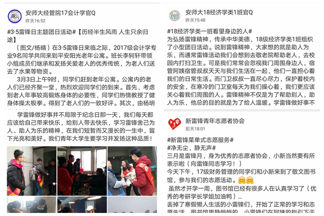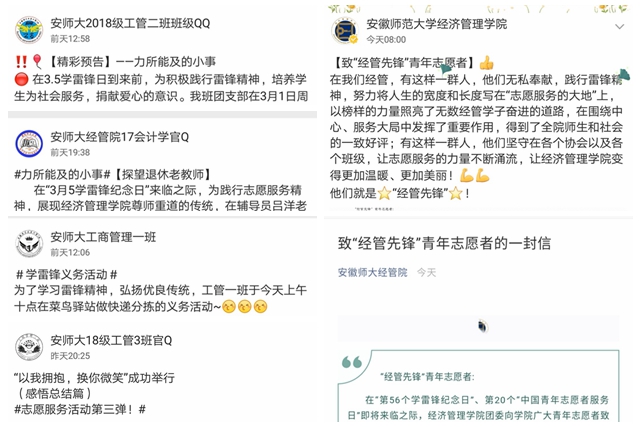 雷锋精神已深深扎根师大,融入m88官网青年的内心。3月以来,m88官网各年级各专业团支部纷纷组织召开“走进新时代,弘扬雷锋精神”、“雷锋精神大家谈”、“我身边的校园雷锋人”等主题班会,分享身边“校园雷锋人”的故事,以积极向上的态度传递雷锋精神,弘扬雷锋精神正能量。