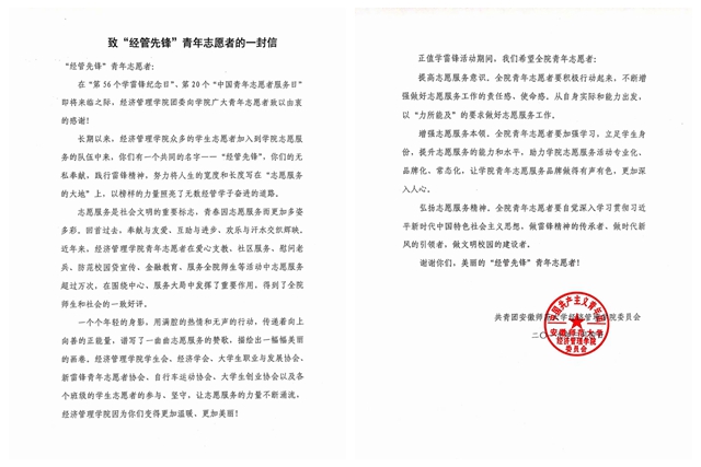 多年来,m88官网一届又一届、一批又一批的青年志愿者加入到公司志愿服务的队伍中,发挥了榜样的力量,践行着雷锋精神。3月4日,经济管理管理公司团委向公司青年志愿者发布了《致“经管先锋”青年志愿者的一封信》,感谢公司以新雷锋青年志愿者协会为代表的青年志愿者在爱心支教、社区服务、防范校园贷宣传、金融教育等方面发挥的重要作用,勉励公司青年志愿者继续行动,发挥作用和力量。