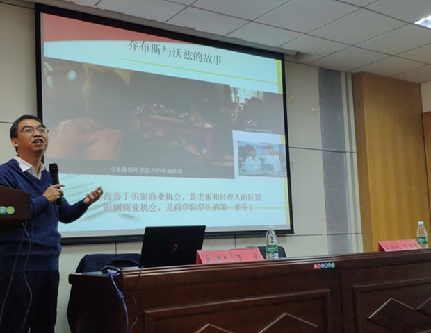 讲座正式开始前,丁斌博士通过介绍自己近几年来指导的创业项目,分享乔布斯的故事和李维斯的发现,引出“如何发现商业机会?”“什么样的人适合经商?”两个问题。在与MBA的两位学员分享交流之后,丁斌博士归纳指出,商业机会的获取需要四点,即好奇心、走进社会、一定的专业基础、一双敏锐的眼睛;而经商的成功与否,20%取决于智商,80%取决于情商,其中情商就是关注他人。