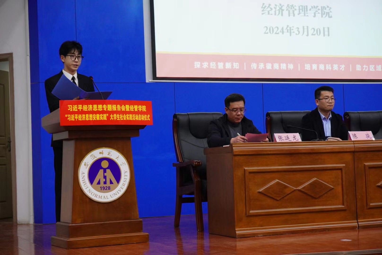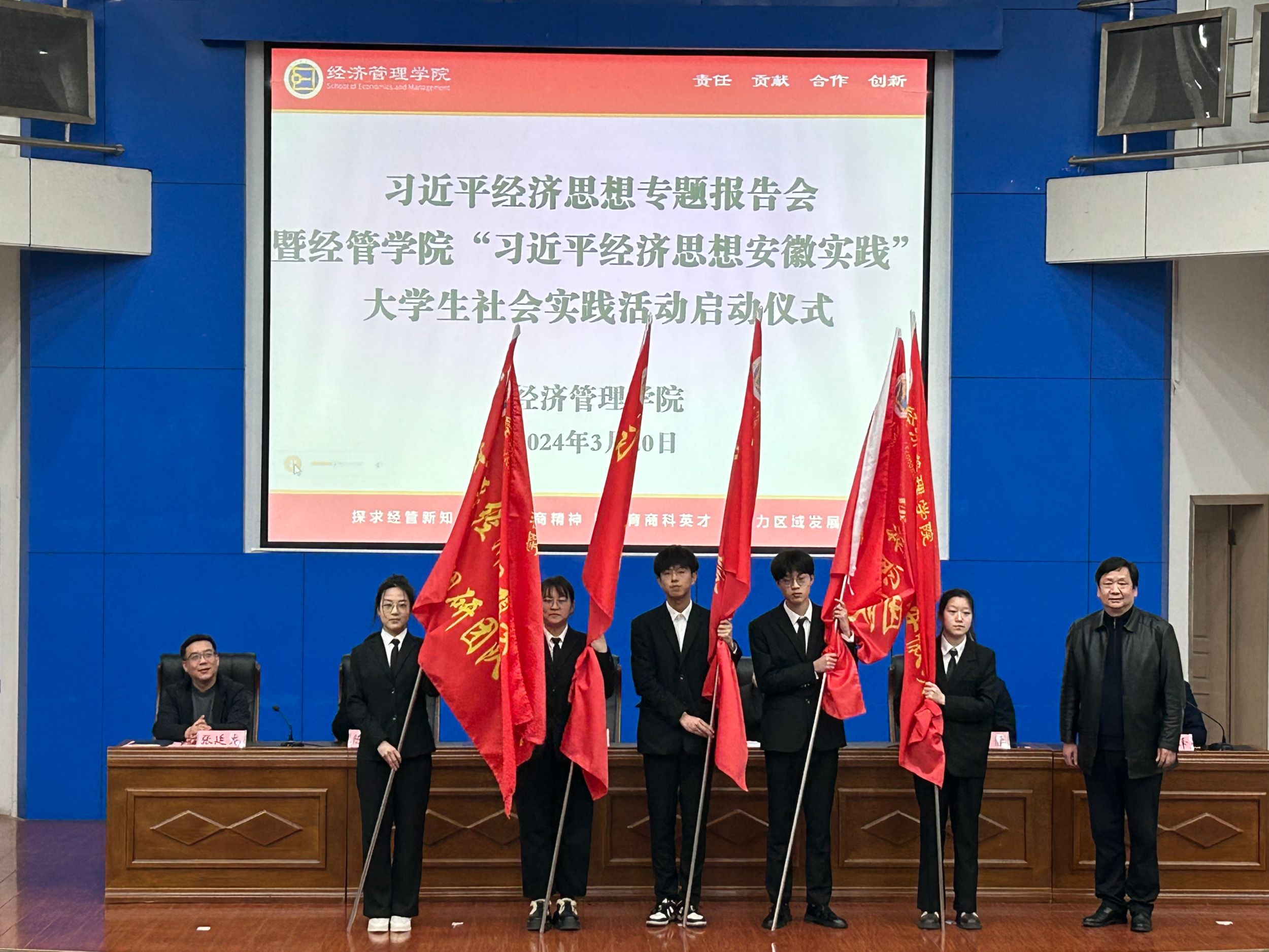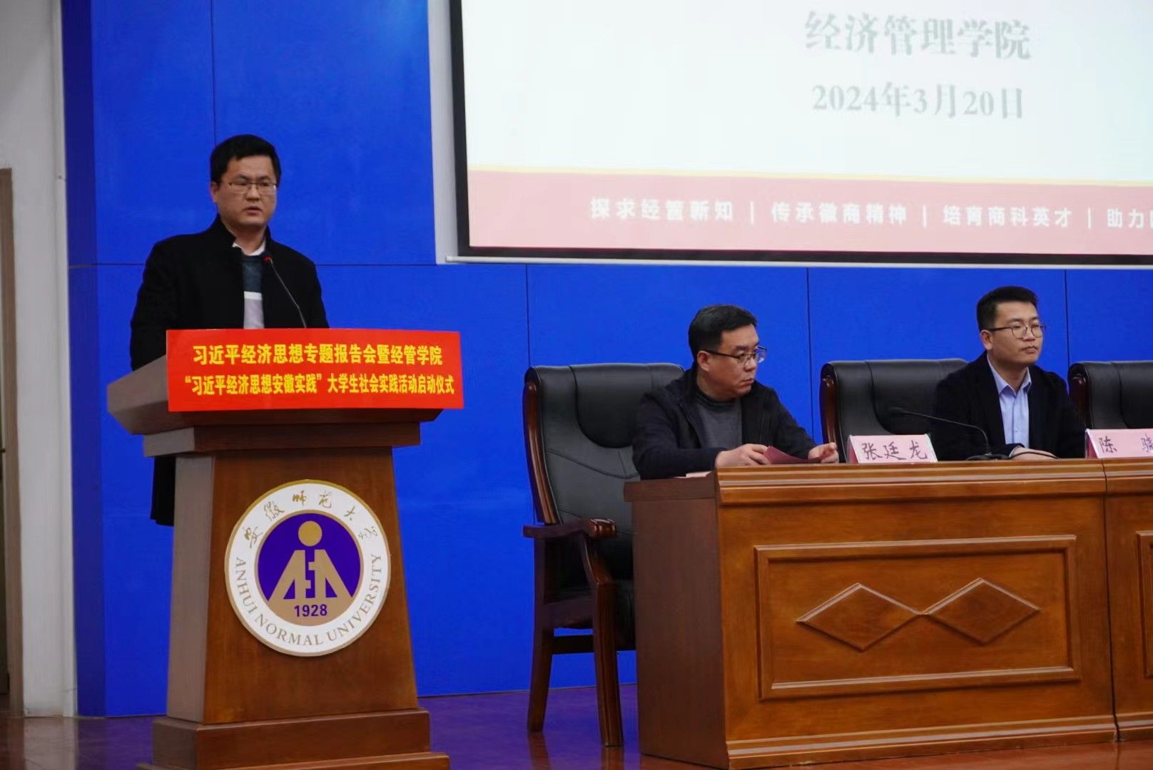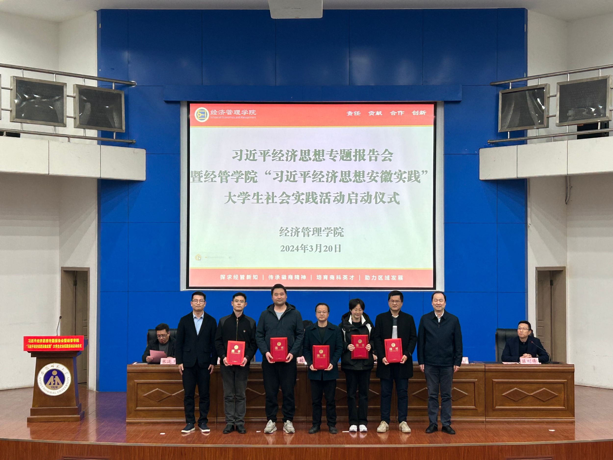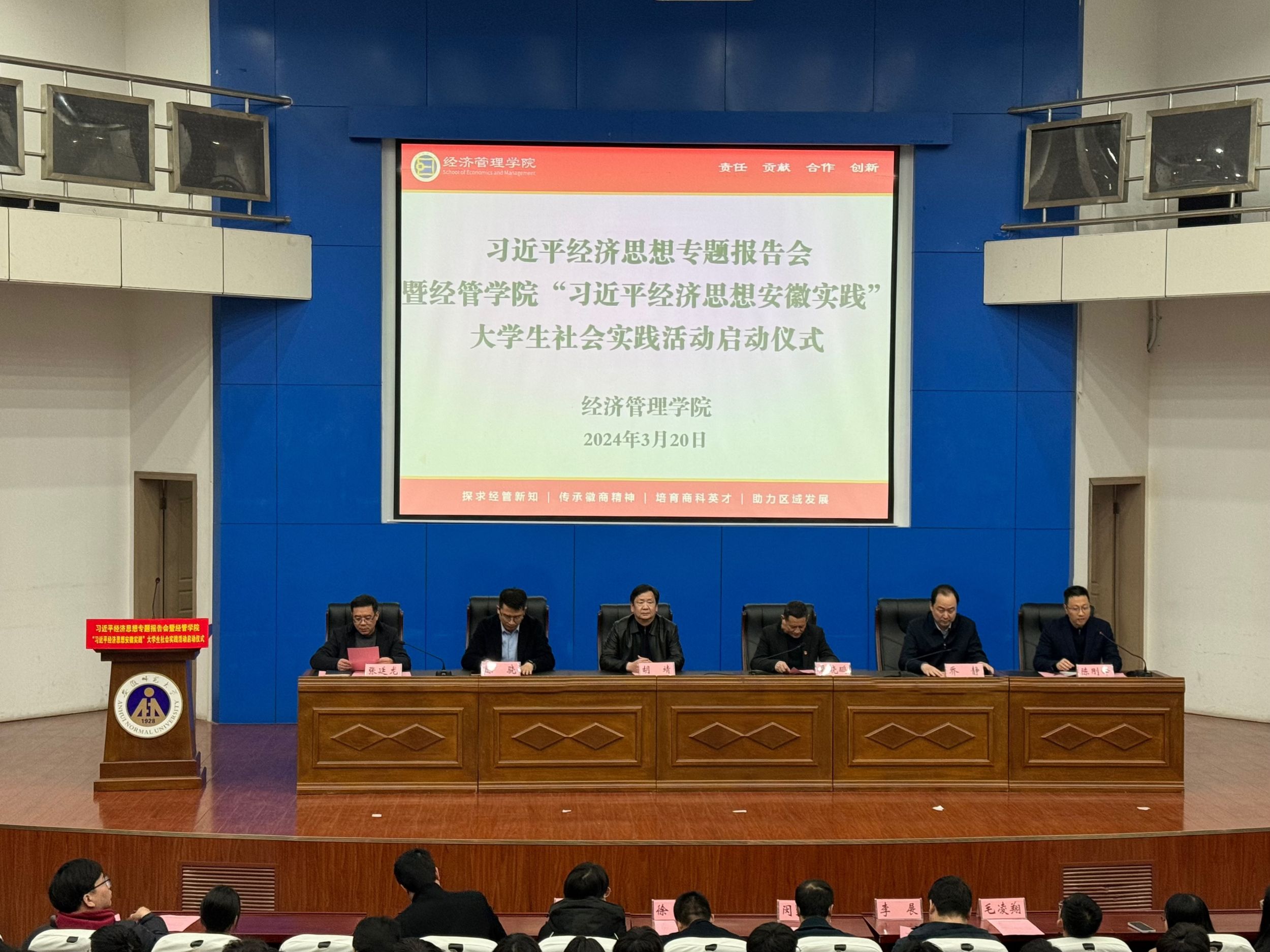 为深入学习贯彻习近平新时代中国特色社会主义思想和习近平总书记关于“大思政课”的重要指示批示精神,深入推进习近平经济思想“三进”。3月20日下午,m88官网在版权所有 m88官网-登录入口敬文图书馆报告厅举行习近平经济思想专题报告会暨“习近平经济思想安徽实践”老员工社会实践活动启动仪式。公司党委常委、党委宣传部部长胡靖,中共安徽省委党校(安徽行政公司)经济学教研部主任、省委讲师团高端宣讲专家裴晓鹏教授,校团委副书记陈骁,公司党委书记乔静、经理张廷龙,公司“习近平经济思想安徽实践”调研团队指导教师、团队负责人,全院研究生、本科生代表参加。启动仪式由公司党委副书记陈刚锋主持。