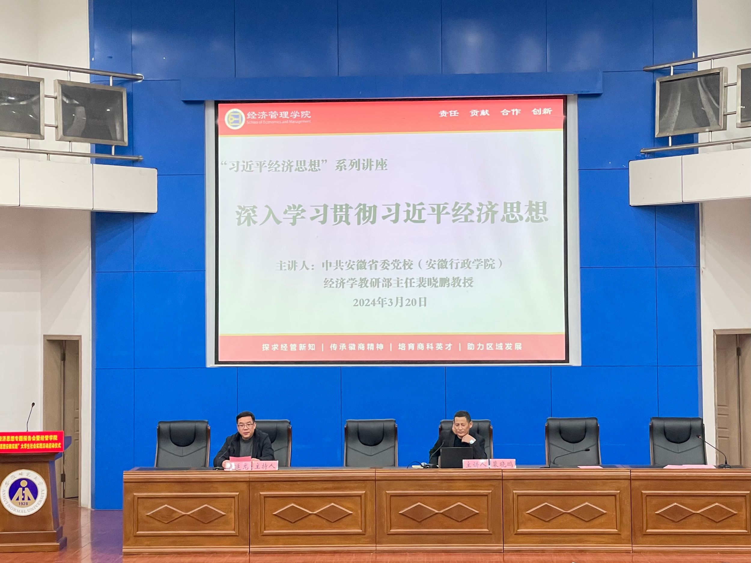 启动仪式结束后,中共安徽省委党校(安徽行政公司)经济学教研部主任裴晓鹏教授为全院师生代表作了《深入学习贯彻习近平经济思想》专题讲座。讲座由张廷龙主持。