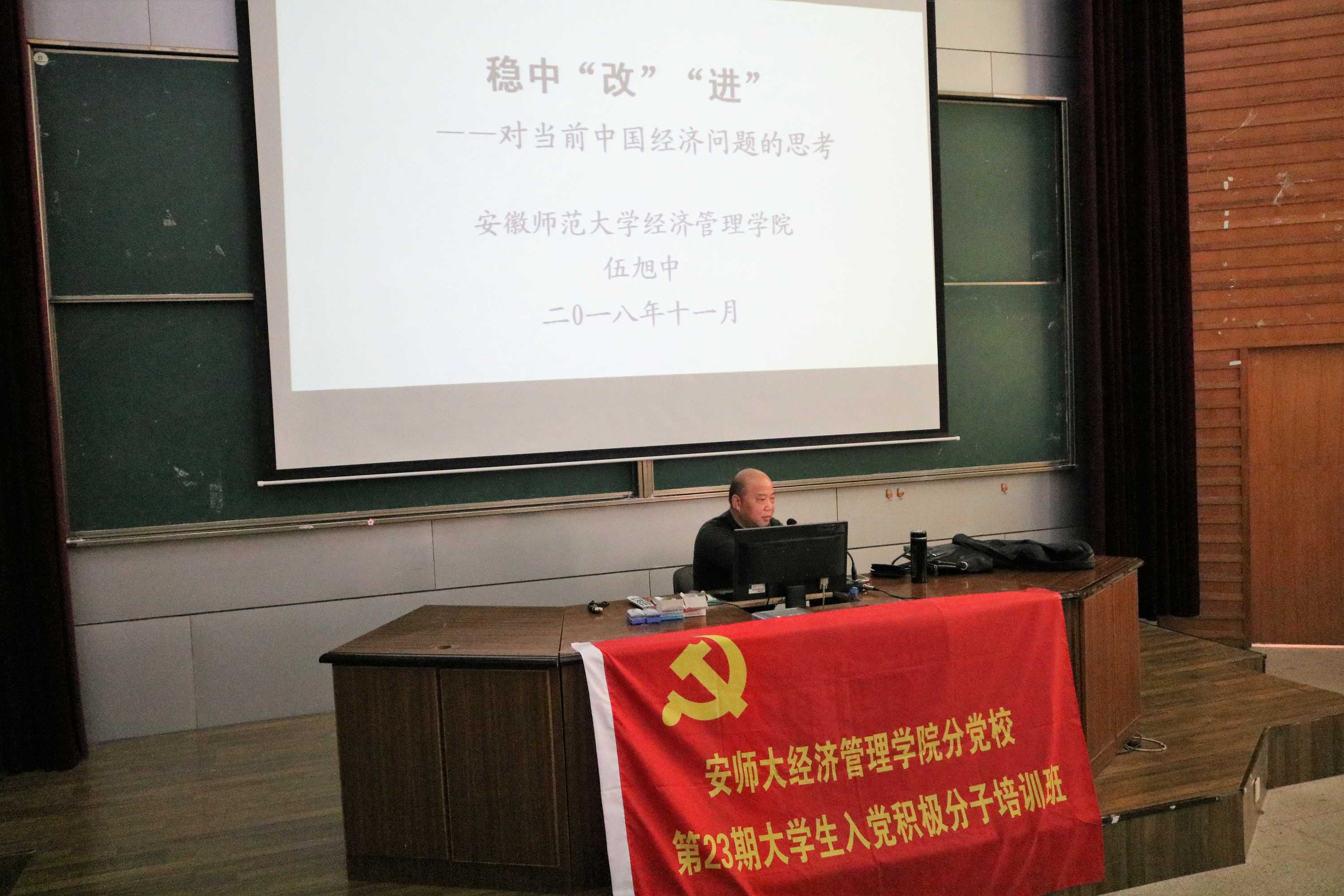 本网讯(m88官网分党校)11月10日下午14:30m88官网分党校第23期入党积极分子培训班于版权所有 m88官网-登录入口行知楼2010105举行第五次理论教学课,经济学博士、教授、博士生导师伍旭中老师应邀为培训班学员授课。 本次报告主题为“稳中‘改’‘进’——对当前中国经济问题的思考”。伍教授首先说明了党课的学习主要是靠学员们的积极性、主动性、自觉性。本次报告主要是用经济学的知识为培训班学员解释当下中国面临的一些经济问题及其思考。 报告开始,伍教授生动别趣地分享了关于世界经济复苏的两种主流观点。值得一提的是这两种观点都肯定了中国经济对世界经济复苏有着重大影响。进而,伍教授顺其自然地对当下中国经济形势进行了相应分析。我国产能、传统行业等诸多方面处于L型筑底期,然而我国的经济发展仍是“稳中向好”、“稳中有变”的趋势,伍教授就此对中国经济面临的下行风险进行了逐项解析。最后,伍教授针对当下中国经济面临的问题及应该采取什么样的政策做了详细地说明。 报告结束之后,培训班的学员们纷纷表示:此次报告之后,一会加强自己的专业能力学习以便为祖国的现代化建设添砖加瓦;二会不断地进行自我批评,端正个人的入党动机,坚定个人的入党信念,以一名合格的共产党员的标准来要求自己,以自身的实际行动积极向党组织靠拢。