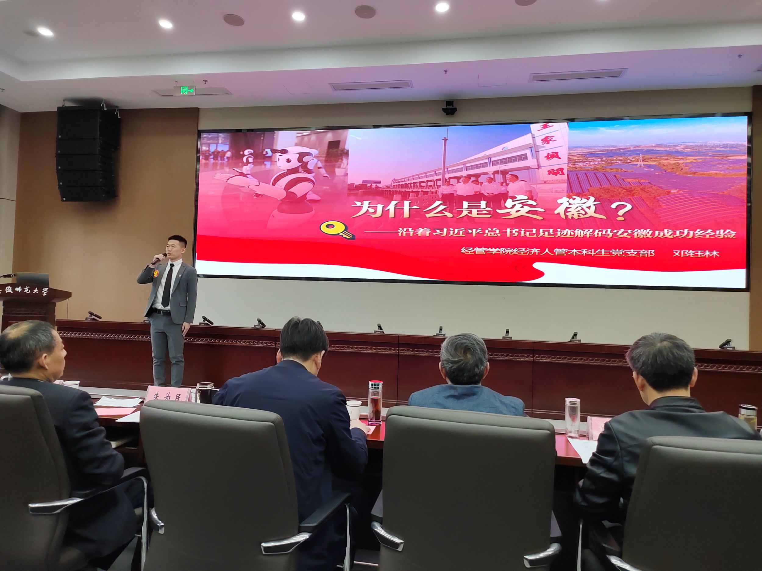 经济人管本科生党支部员工党员邓钰林以沿着习近平总书记的安徽足迹,选择凤阳小岗村、金寨大湾村、奇瑞汽车为切入点,解读了按下农村改革发展“红手印”、递交金寨脱贫振兴“新答卷”、跑出安徽制造创造“加速度”三个故事,深入阐释了从改革开放到新时代,从凤阳小岗村到金寨大湾村,从传统农业到现代产业,从脱贫攻坚到乡村振兴,从安徽制造到安徽创造,安徽社会经济发展成功的“三把钥匙”。