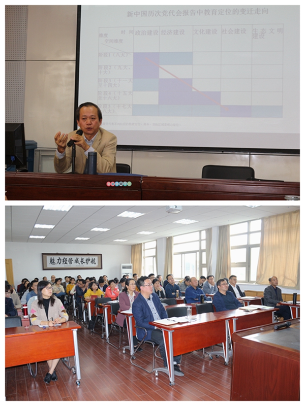 阮成武教授分析了全国教育大会召开的背景,分享了学习习近平在全国教育大会上的讲话心得,围绕“教育是国之大计、党之大计”的逻辑链,从教育的政治站位、功能地位、格局定位、发展道路、目标任务等十个方面详细解读了全国教育大会的主要精神,并用“2035教师之塔”引导教师明确责任担当,树立立德树人的目标导向,努力提升自身的综合素质、专业化水平和创新能力,勇担传播知识、传播思想、传播真理、塑造灵魂、塑造生命、塑造新人的时代重任,为培养六有新人贡献自己的智慧和力量。