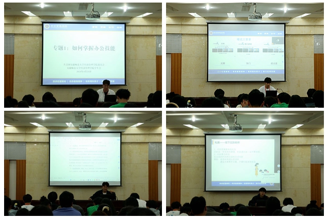 专题培训环节,主席团成员面向全体员工骨干进行专题培训。徐梦龙围绕公文写作与技巧、PPT制作与技巧、表格制作与技巧三部分对员工会成员的办公技能展开培训。刘庚源就会议与活动中的摄影摄像,分享了摄影过程中的技巧与常见错误。陆宇洲结合军训服装捐赠活动,详细介绍了一场活动从策划到组织开展的各个步骤。马跃详细介绍了商务礼仪与基础礼仪,姚茂林结合具体事例分享团学活动中常见问题的解决方法。