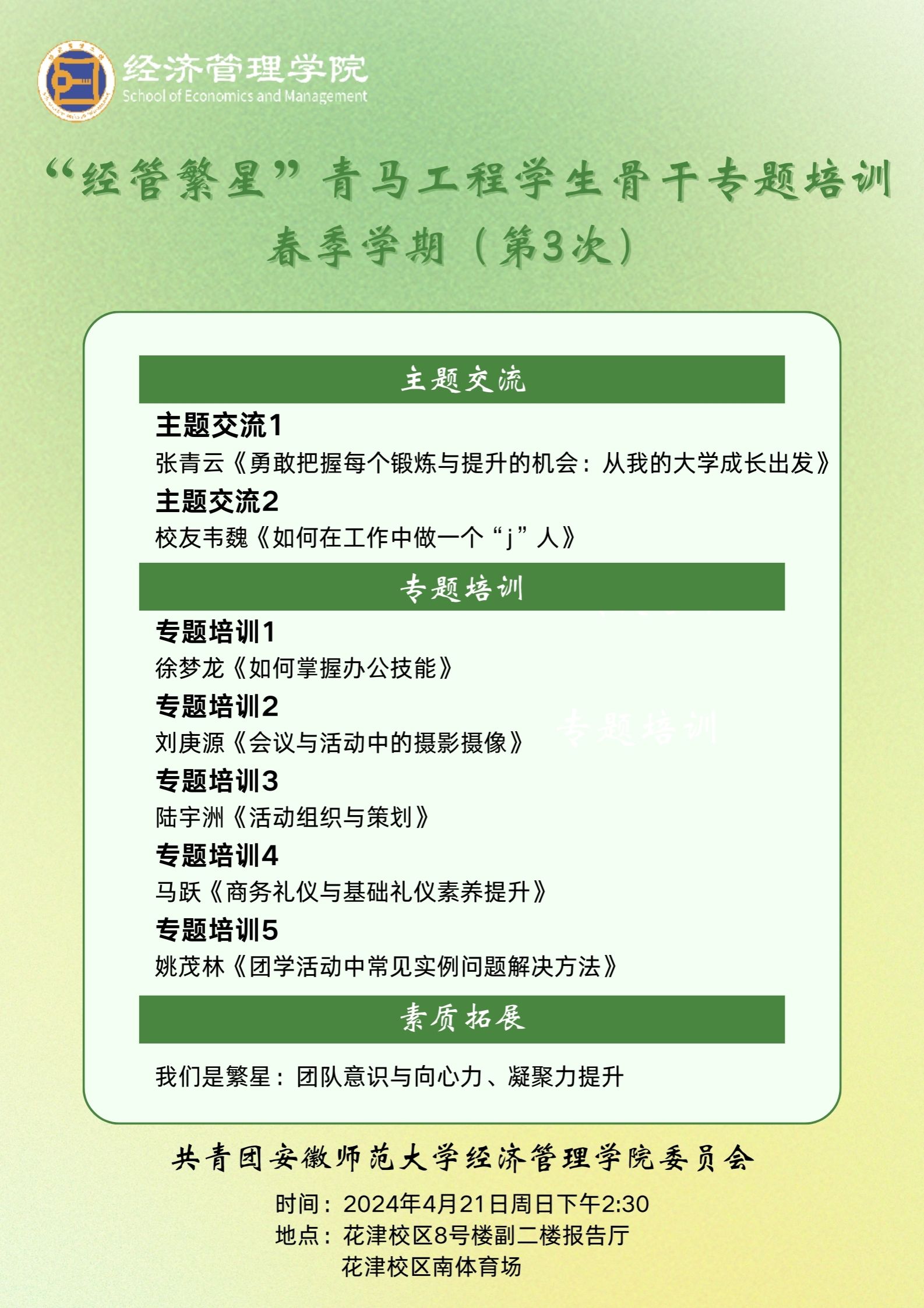 m88官网坚持“五育并举”育人理念,将“老员工护航行动计划”落实落细,此次专题培训为员工骨干提供了交流和分享的机会与平台,展现了经管学子积极向上的面貌,进一步提升了员工骨干的能力与综合素养。