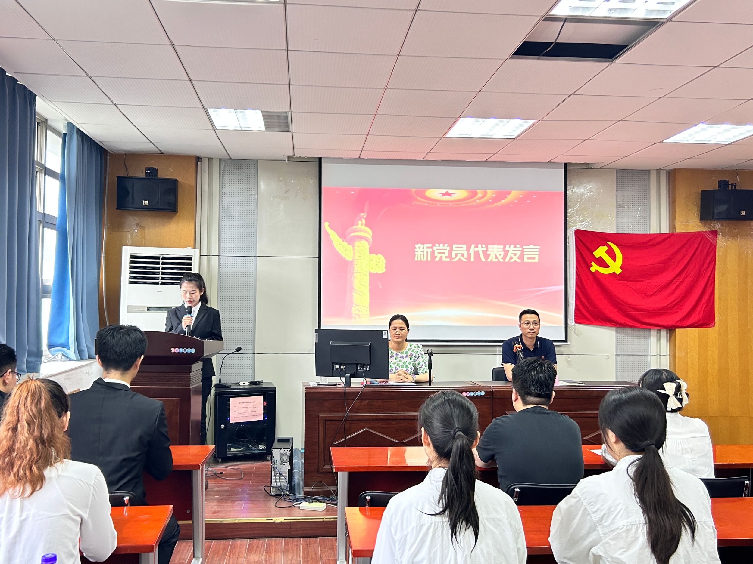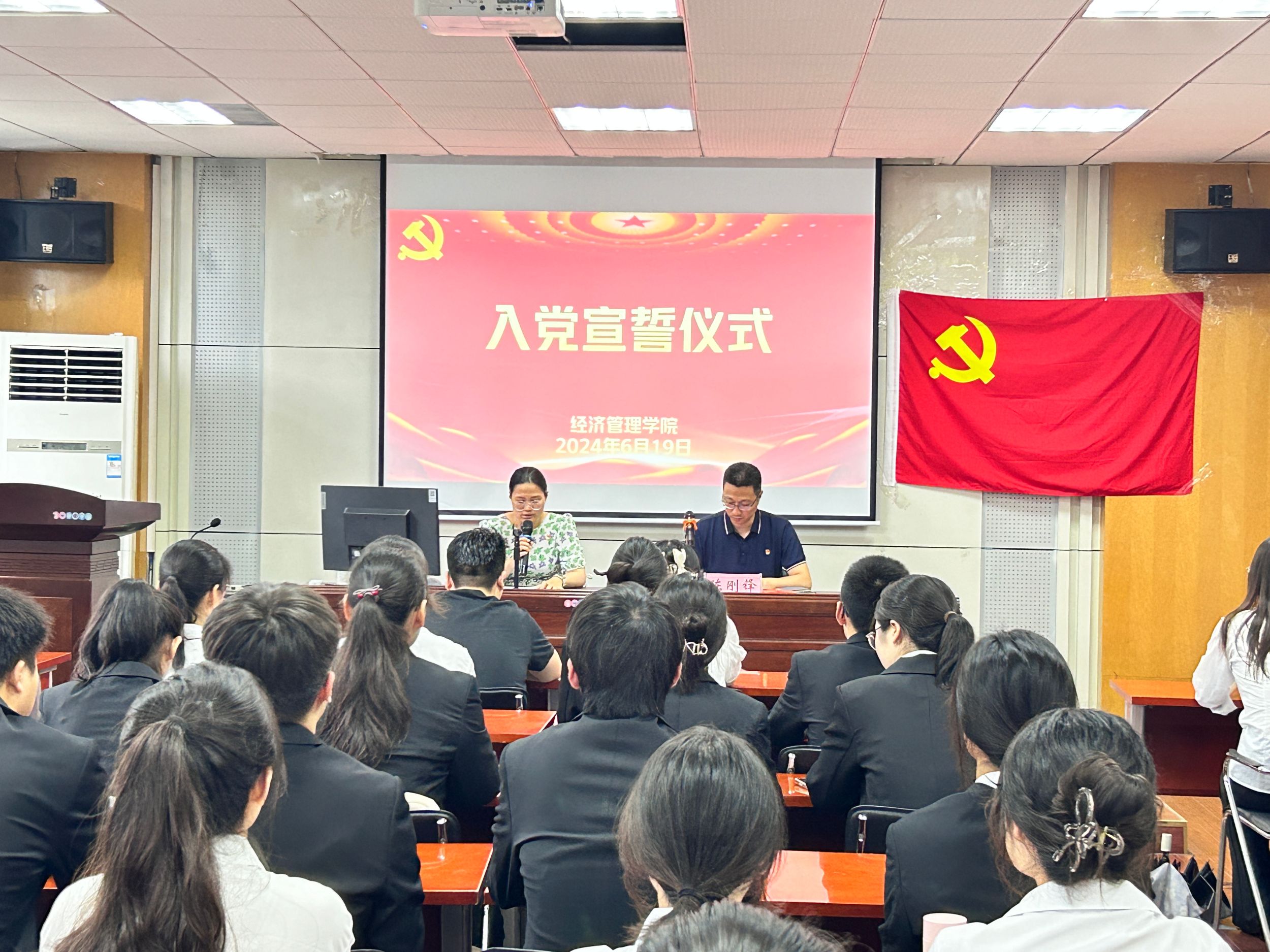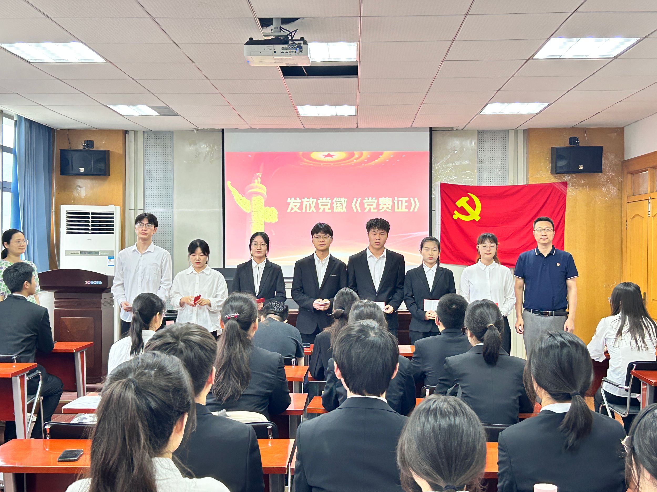 在庄严的国歌声中入党宣誓仪式正式拉开了序幕。会计学本科生党支部书记刘胡海宣读了新发展党员名单,陈刚锋为新发展党员佩戴党员徽章、颁发党费证。财务管理本科生党支部书记李佳颖带领新发展党员进行宣誓,在场人员起身肃立,面向鲜红的党旗庄严宣誓,在激昂的宣誓声中,每位党员都接受了一次深刻的思想洗礼,进一步强化了对党忠诚、全心全意为人民服务的使命。随后预备党员代表孙玉婷同志发言表示,自己将永远铭记共产党员的初心使命,用实际行动践行入党誓词。