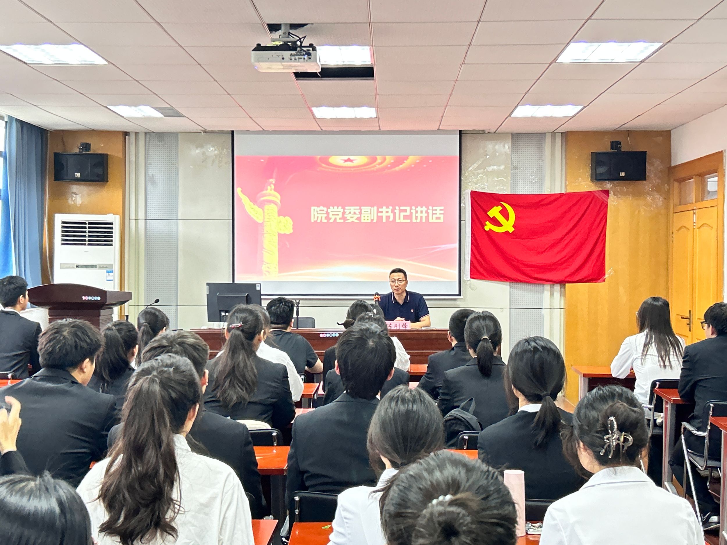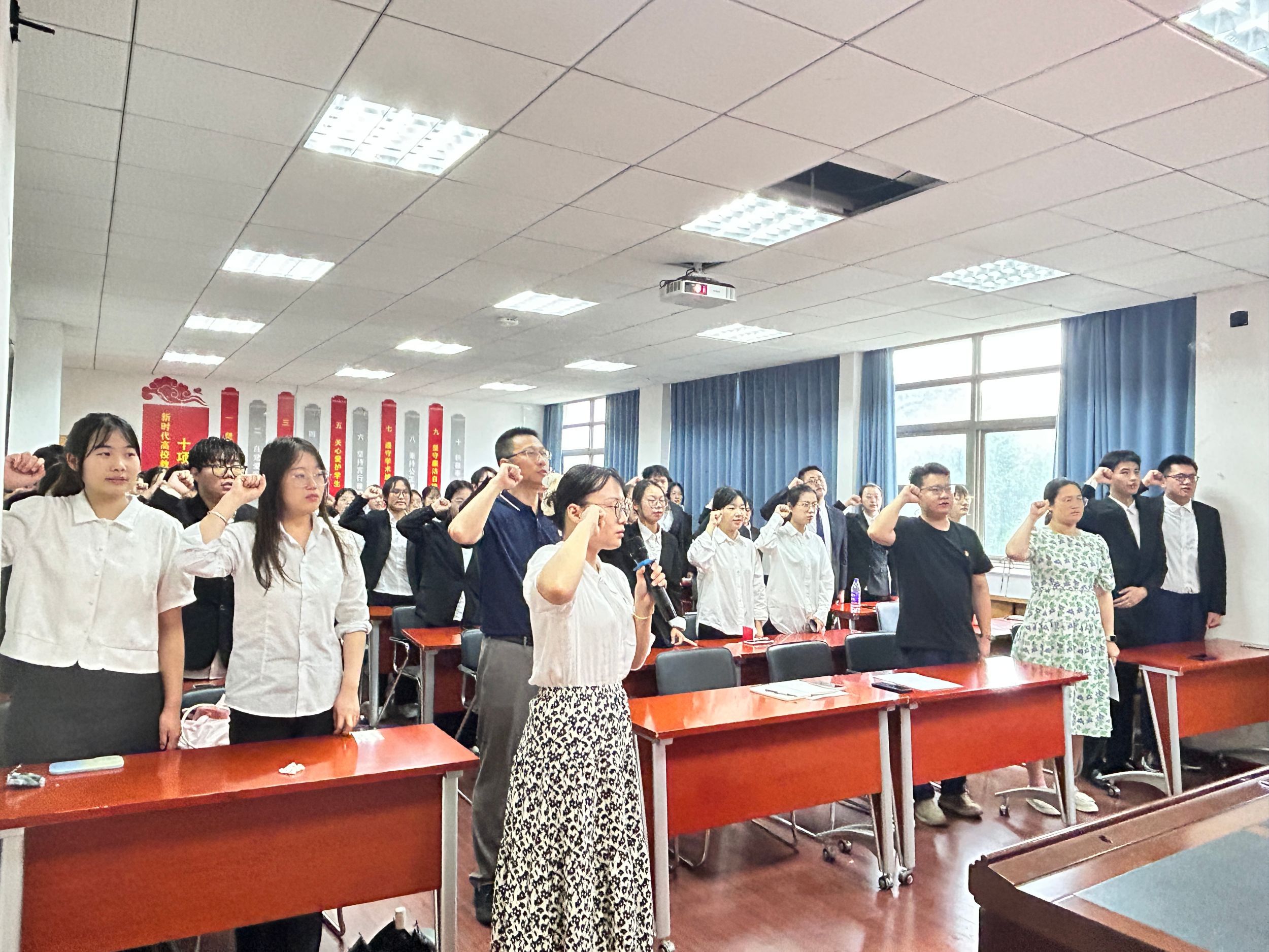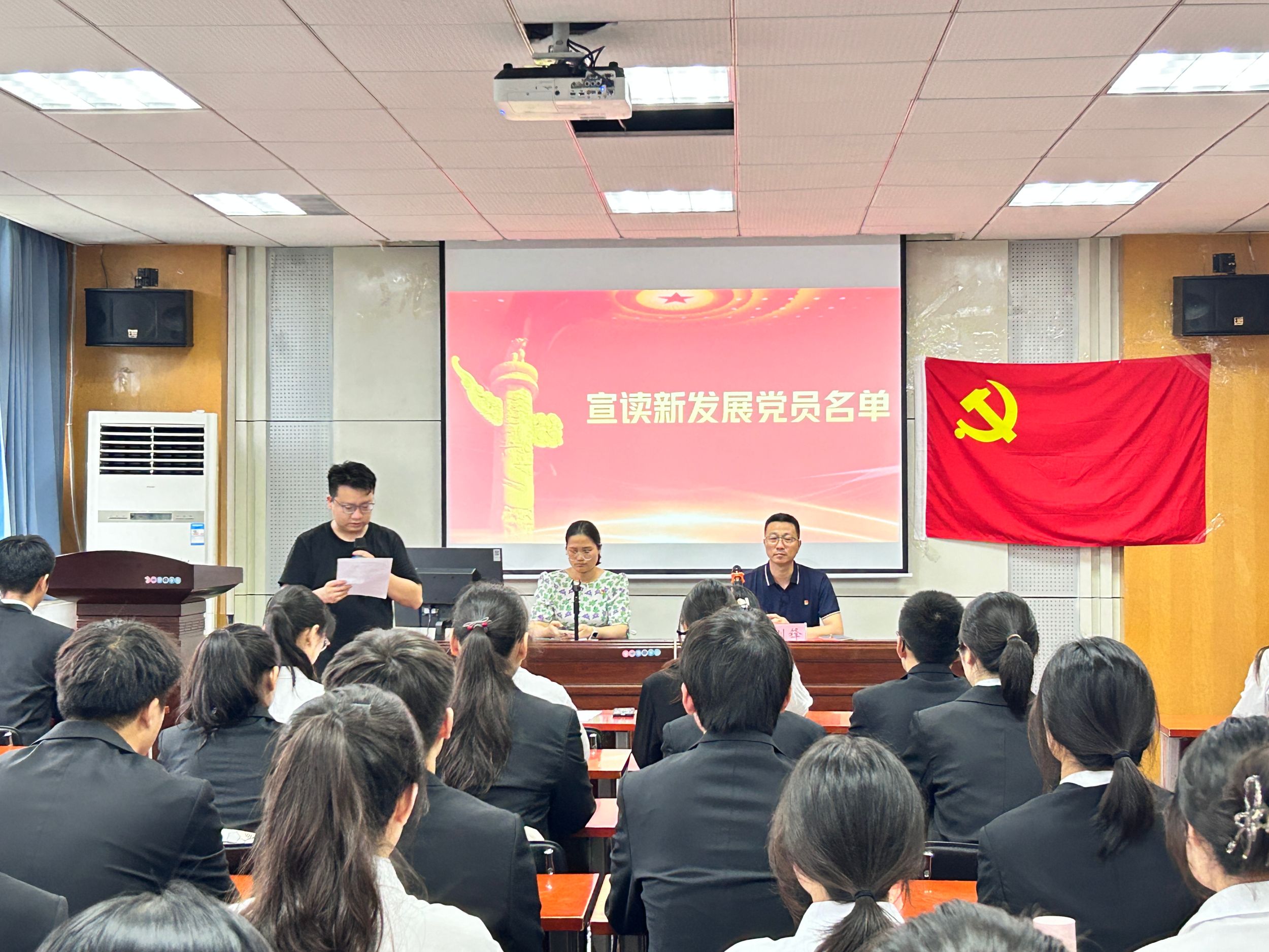 在庄严的国歌声中入党宣誓仪式正式拉开了序幕。会计学本科生党支部书记刘胡海宣读了新发展党员名单,陈刚锋为新发展党员佩戴党员徽章、颁发党费证。财务管理本科生党支部书记李佳颖带领新发展党员进行宣誓,在场人员起身肃立,面向鲜红的党旗庄严宣誓,在激昂的宣誓声中,每位党员都接受了一次深刻的思想洗礼,进一步强化了对党忠诚、全心全意为人民服务的使命。随后预备党员代表孙玉婷同志发言表示,自己将永远铭记共产党员的初心使命,用实际行动践行入党誓词。
