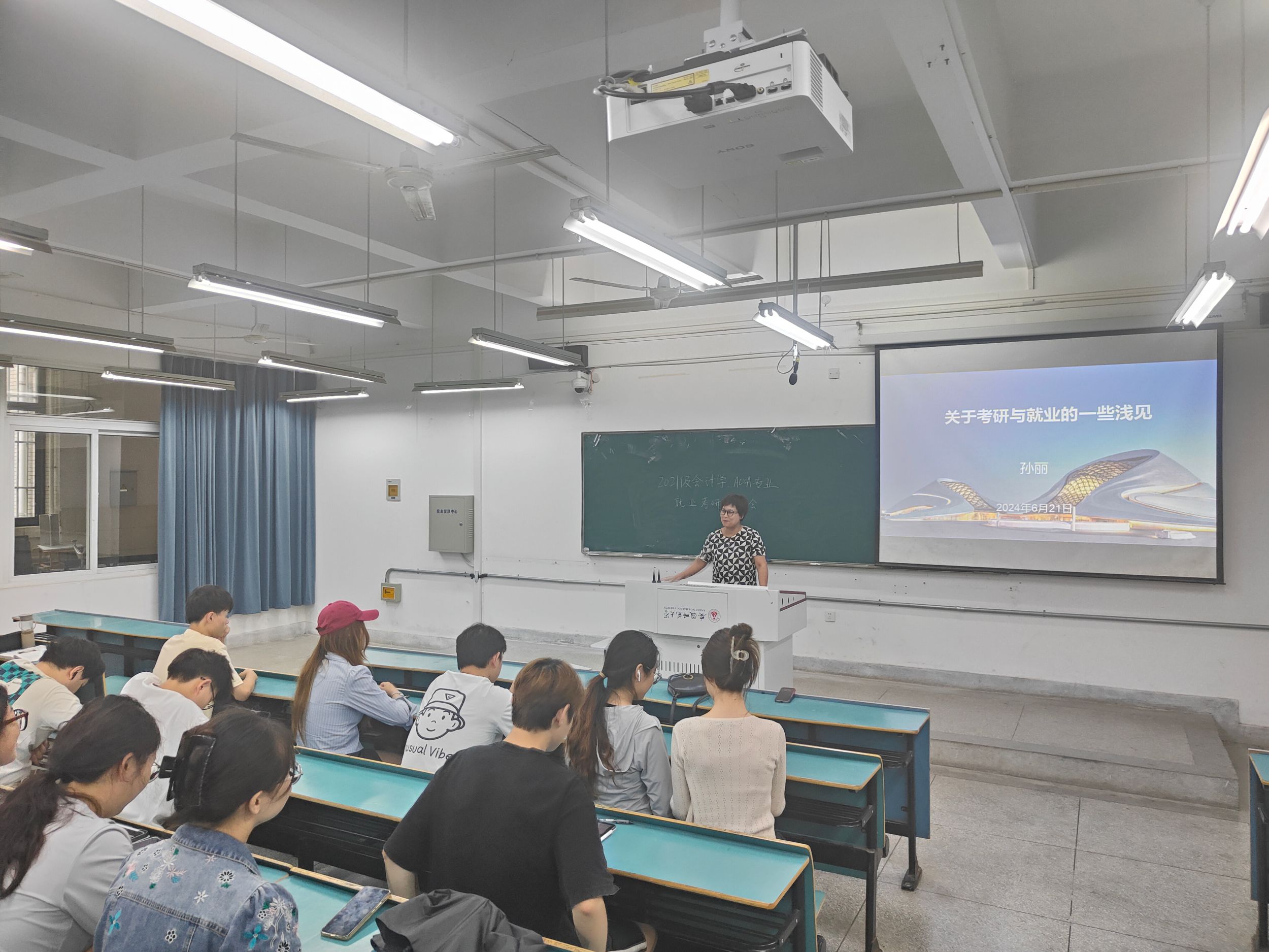 随后,财会专业负责人徐飞深入分析了当前财会专业的就业形势和考研前景。他指出,随着经济的持续发展和科技的日新月异,财会专业依然拥有广阔的就业前景,但同时也面临着一定的挑战。他建议同学们要密切关注行业动态,深入了解市场需求,不断提升自身的专业素养和实践能力。