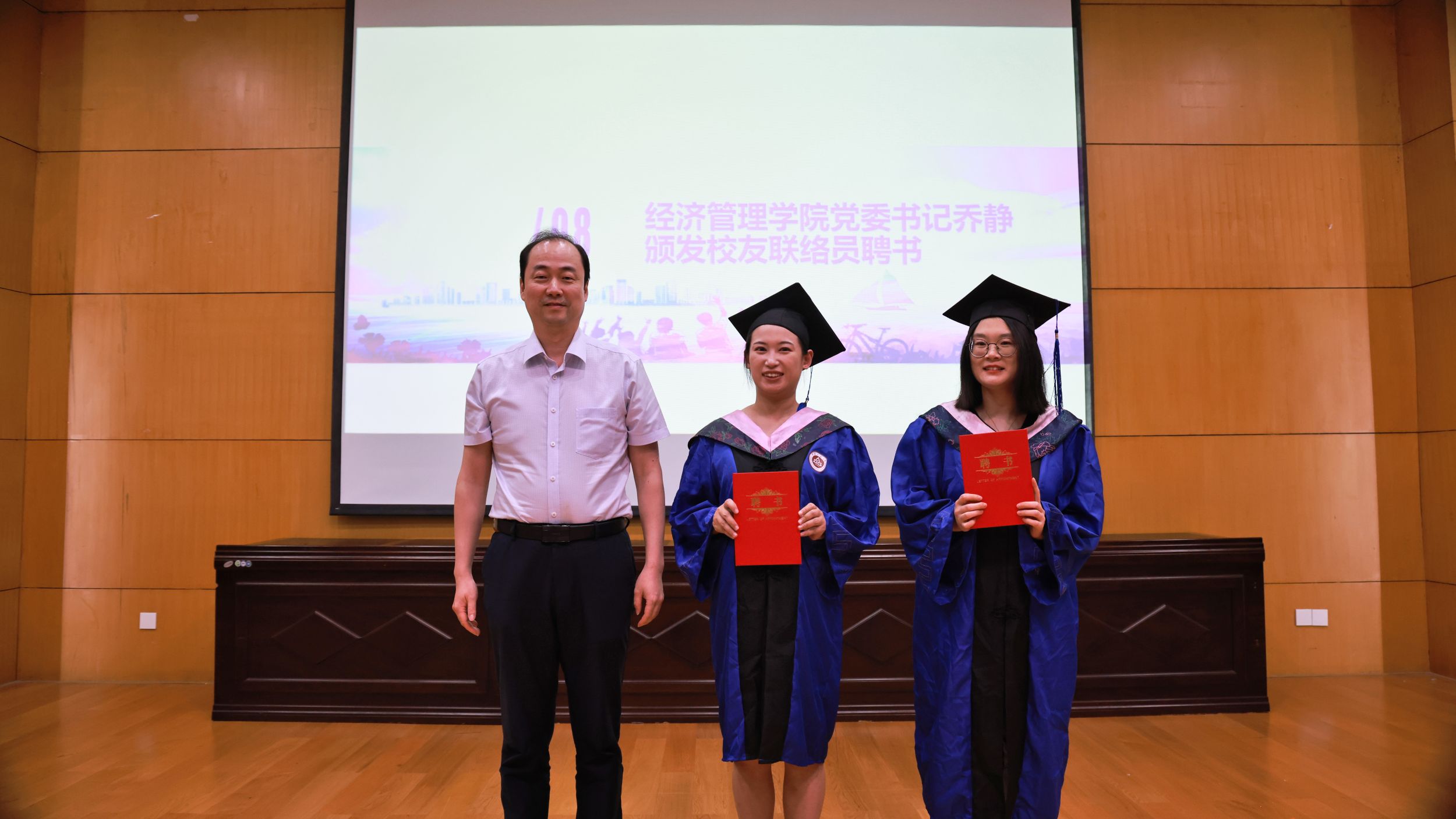 乔静代表公司向阿丹妮、朱丹丹两位同学颁发员工联络员聘书。