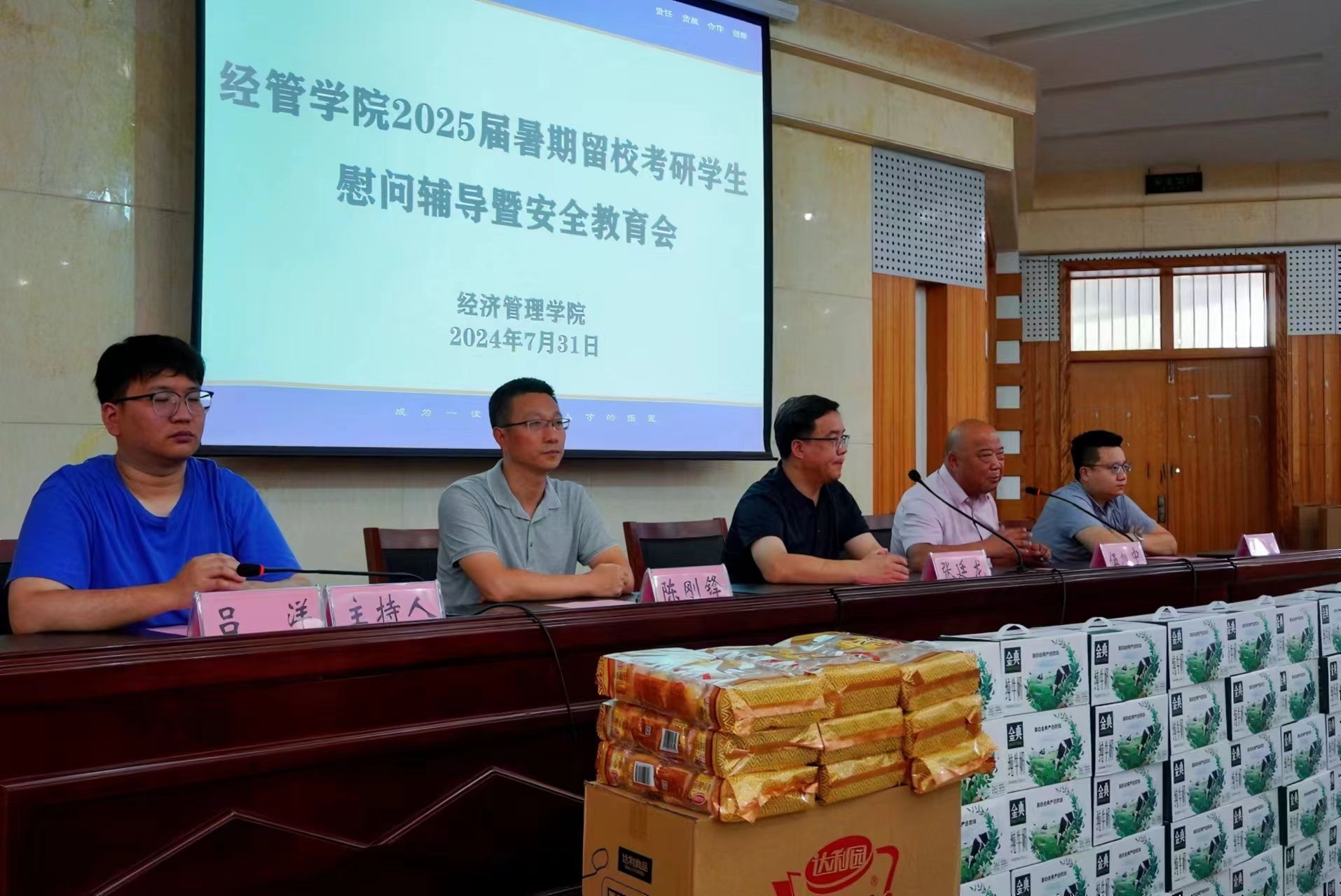 为加强对留校考研员工管理和安全教育,落实老员工护航行动计划,7月31日下午,m88官网开展2025届暑期留校考研员工慰问辅导暨安全教育会。m88官网经理张廷龙、副经理伍旭中、党委副书记陈刚锋,2025届毕业班辅导员刘胡海、吕洋和2025届暑期留校考研全体员工参加。会议由团委书记吕洋主持。