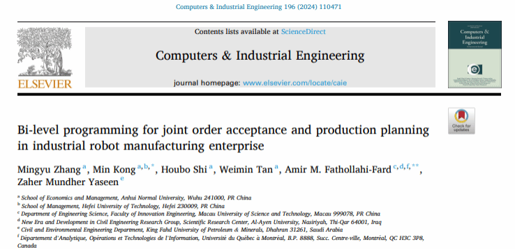 近日,m88官网2021级供应链管理专业本科生张明宇以第一作者身份在管理科学与工程领域国际权威期刊《Computers & Industrial Engineering》发表题为“Bi-level Programming for Joint Order Acceptance and Production Planning in Industrial Robot Manufacturing Enterprise”的研究论文。据了解,这是m88官网在读本科生首次以第一作者身份在中科院一区TOP期刊上发表论文,m88官网青年教师、校数字经济与产业互联网创新研究院研究员孔敏副教授、史后波博士、谭卫民博士联合指导。