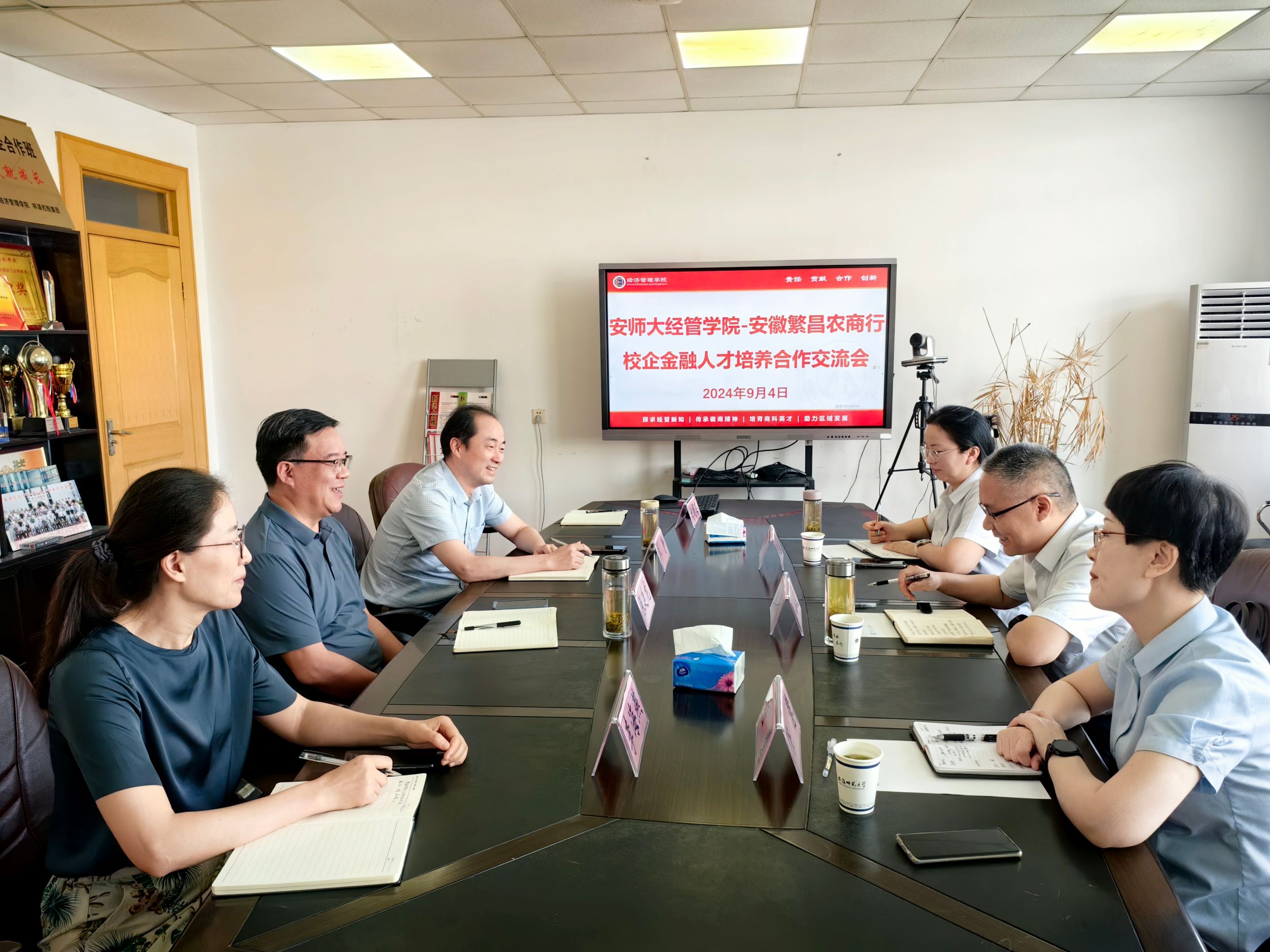9月4日上午,m88官网与安徽繁昌农村商业银行在公司四楼会议室举行了校企金融人才培养合作交流会。安徽繁昌农村商业银行党委书记、董事长戴小波,党委委员、纪委书记任慧,人力资源部经理俞月霞,公司党委书记乔静、经理张廷龙、副经理李海燕、辅导员刘胡海一同参加了此次座谈会。座谈会由乔静主持。
