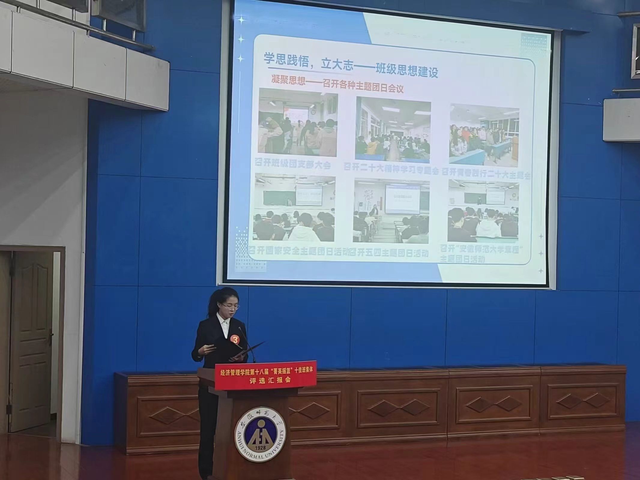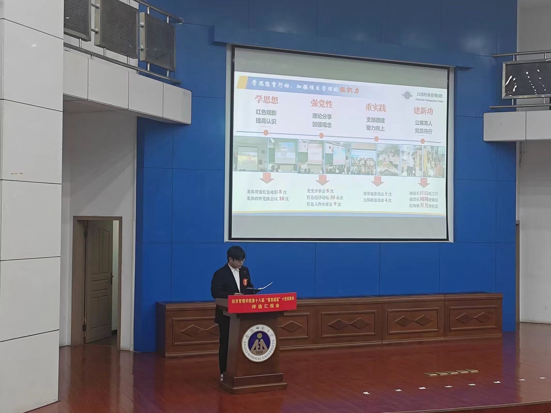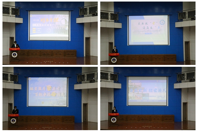 评选汇报会上,17个班级根据抽签顺序结合PPT形式,围绕各自的组织建设、制度建设、精神文明建设、党团建设、学风创建、优秀学子风采、特色活动、公益实践等方面对上一年来的班级工作进行全面总结。汇报班级都有严格的班级管理制度,规范的活动组织制度,强有力的凝聚力建设,良好的班风建设。其中,2021级财务管理1班从组织力、领导力、运营力三个方面进行总结,强调每个人都要学会经营自己,成为自己的CEO,并在此基础上扎实基础,追求卓越;2023级经济学2班提出“善己日新,经世济民”的班级建设文化,强调班集体建设的核心力;2023级财务管理1班则围绕“聚沙成塔,星火燎原”,强调凝聚力对班级建设的重要性。