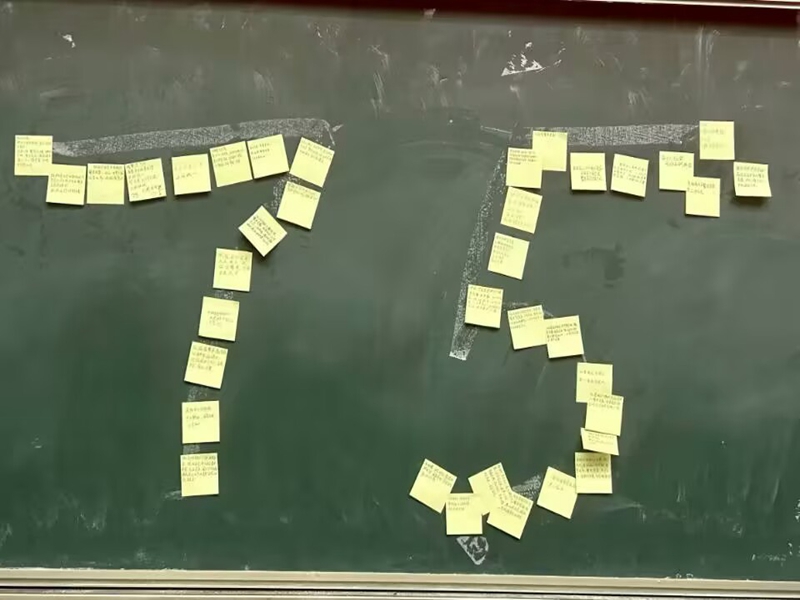 写下祝福表白祖国。积极开展“祝福墙”表白活动,每位员工用便签写下自己对祖国的祝福与未来的憧憬,并依次走上讲台将便签贴在黑板上,最终形成了一个熠熠生辉的巨大“75”字样,象征着祖国光辉的75年历程,表达了全体同学对祖国未来更加繁荣昌盛的美好期盼。