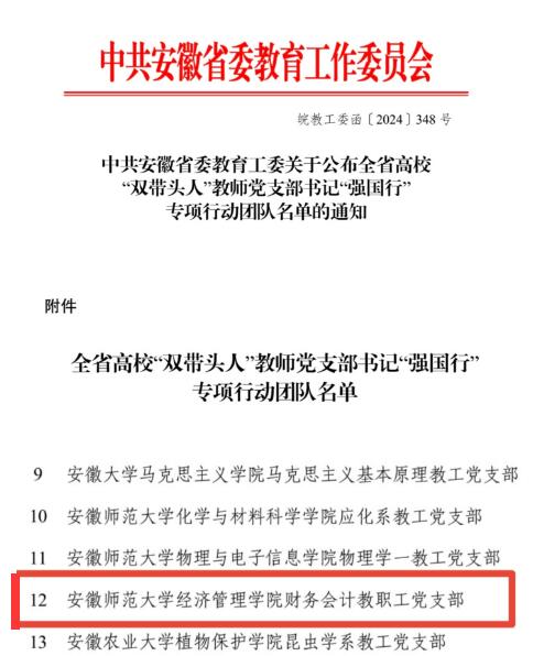 近日,中共安徽省委教育工委公布了全省高校“双带头人”教师党支部书记“强国行”专项行动团队名单,公司财务会计教工党支部入选全省高校“双带头人”教师党支部书记“强国行”专项行动团队。