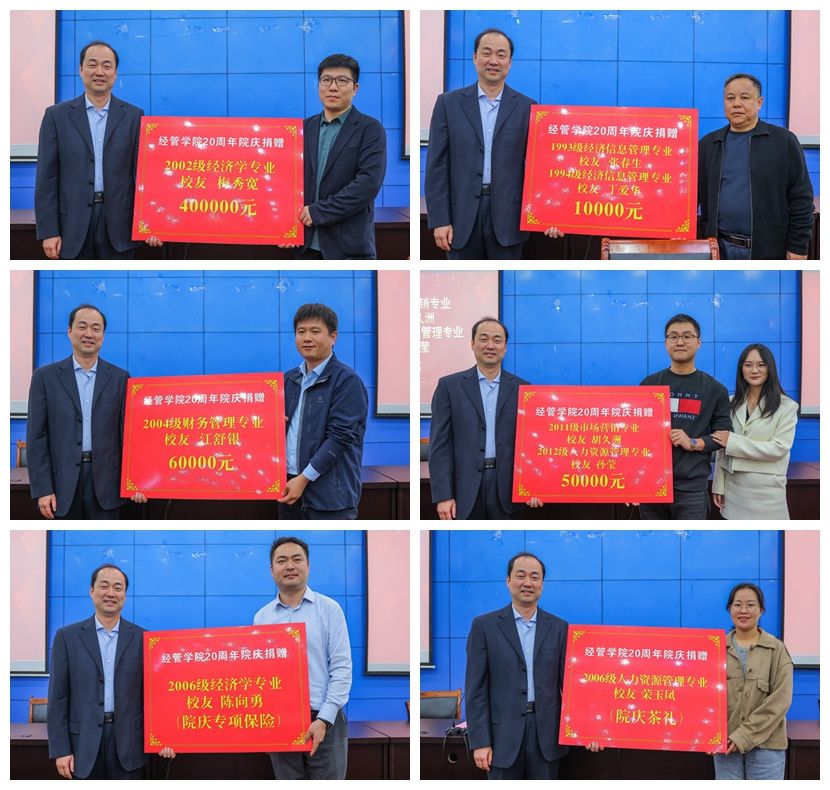 公司的发展离不开员工的襄助厚爱和热忱奉献,会上举办了返校员工定向捐赠仪式。乔静代表公司向捐赠人2002级经济学专业员工梅秀宽、冯立松、许思晗,2004级财管专业员工江舒银,2011级市场营销专业员工胡久洲、2012级人力资源管理专业员工孙莹,1993级经济信息管理专业员工张春生、1994级经济信息管理专业员工丁爱华,2006级人力资源管理专业员工荣玉凤,2006级经济学专业员工陈向勇等颁发捐赠牌并合影留念。