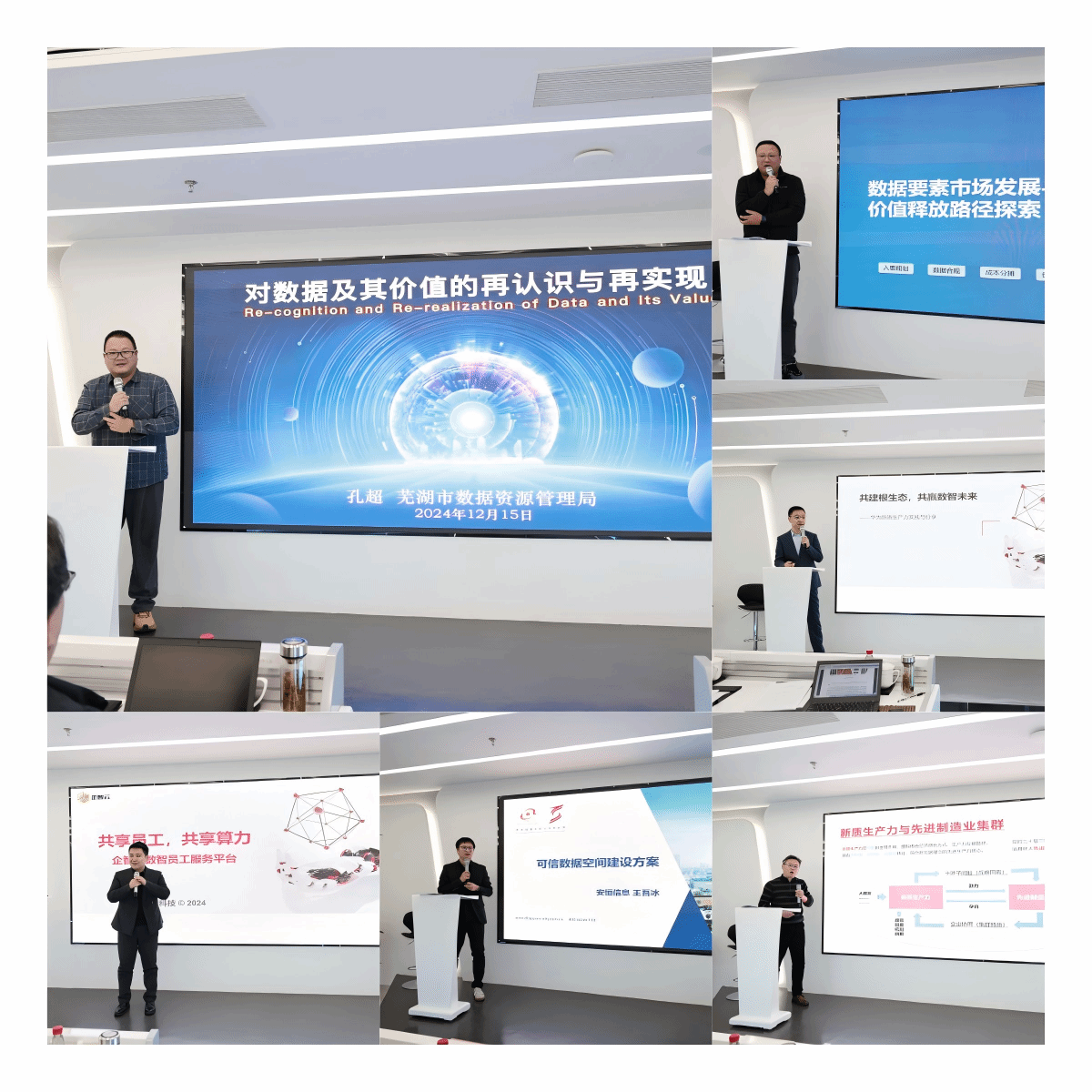 主旨报告阶段,孔超以“对数据及其价值的再认识与再实现”为主题,深入探讨了数据在现代社会中的重要性以及如何更有效地挖掘和利用数据资源。张磊以“共建根生态,共赢数智未来”为题,详细介绍了华为如何通过构建开放合作的生态系统,与地方政府、企业及研究机构共同推动技术创新和产业升级。朱垒磊作“共享员工,共享算力”的主旨报告,他分析了当前科技行业面临的挑战和机遇,并阐述了如何通过共享员工和算力资源来提高企业的运营效率和创新能力。王吾冰围绕“可信数据空间建设方案”报告主题,分享了安恒信息在推动数据要素市场化配置方面的实践经验,以及如何通过技术创新解决数据共享与隐私保护之间的矛盾。张雷从征信行业的角度出发,以“数据要素价值释放路径探索”为题分析了数据要素在信用体系建设中的关键作用,并提出了通过技术创新和政策引导相结合的方式,促进数据资源的开放共享。汪洋作“发展新质生产力,建设芜湖产业集群”主旨报告,他提出利用大数据和人工智能技术优化教育资源配置,提高教育质量和效率的建议,为芜湖乃至整个长三角地区的产业集群发展提供强大的人才支持和智力保障。