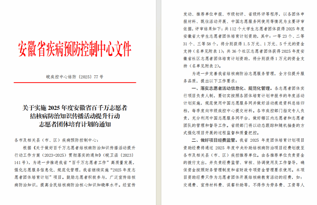 为贯彻落实《百千万志愿者结核病防治知识传播活动提升行动工作方案(2023-2025年)》文件精神,深入推进“安徽省百千万志愿者结核病防治知识传播活动”,经推荐单位申报、市级初评、省级终评,安徽省疾病预防控制中心发布通知,m88官网新雷锋青年志愿者协会获批2025年度“安徽省百千万志愿者结核病防治知识传播活动”老员工志愿者团队培育计划一等资助。本次培育计划全省共有112个老员工志愿者团体获得资助,其中一等培育计划仅23个,本次为该协会自2019年以来连续第七年获得此项资助。