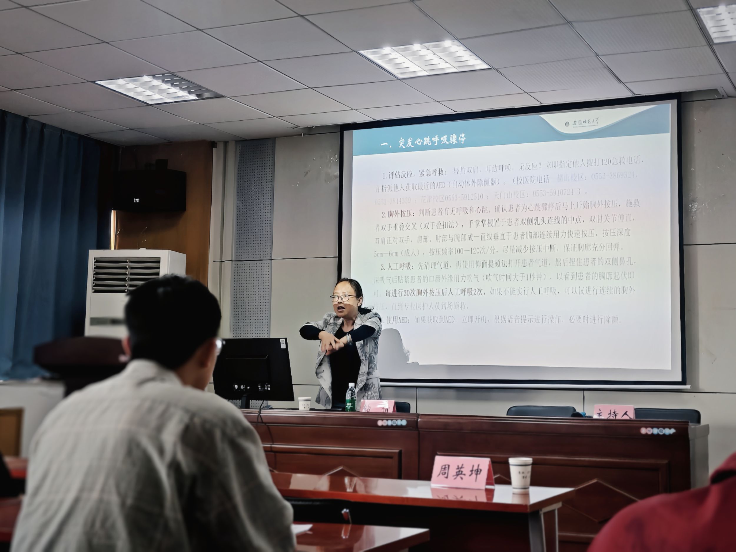 储倩以“守护青春,远离伤害”为主题,列举校园中可能出现的常见事件,详细介绍了应急处置方法。现场演示胸外按压等急救操作的规范动作,介绍了自动体外除颤器(AED)的使用方法及公司内的分布位置。针对异物卡喉、烧烫伤、动物抓咬伤等常见意外,讲解了相应的急救步骤和注意事项,纠正了一些常见的错误处理方式。同时,她还普及了肺结核、艾滋病等传染病的防治知识,提醒同学们在日常生活中要养成良好的卫生习惯,增强自我防护意识。