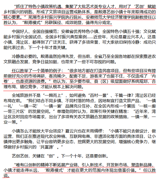 近日,围绕“芜湖殷港艺创小镇十年‘造富’记”,《芜湖日报》专题采访了m88官网任以胜副教授,采访报道《‘空心村’里‘艺’鸣惊人》于5月31日刊出。任以胜在采访中表示,芜湖殷港艺创小镇抓住了特色小镇政策机遇、集聚了大批艺术类专业人才、用对了“艺创”赋能乡村振兴的钥匙、形成了文旅项目运营成熟体系,是殷港艺创小镇十年来取得成功的核心要素。“殷港模式”另辟蹊径、成效明显,值得充分肯定。