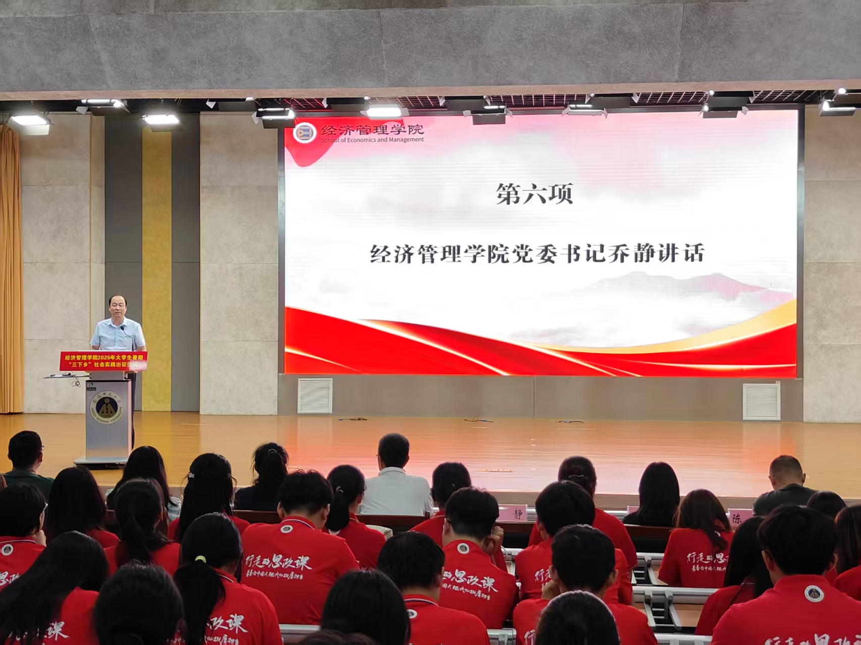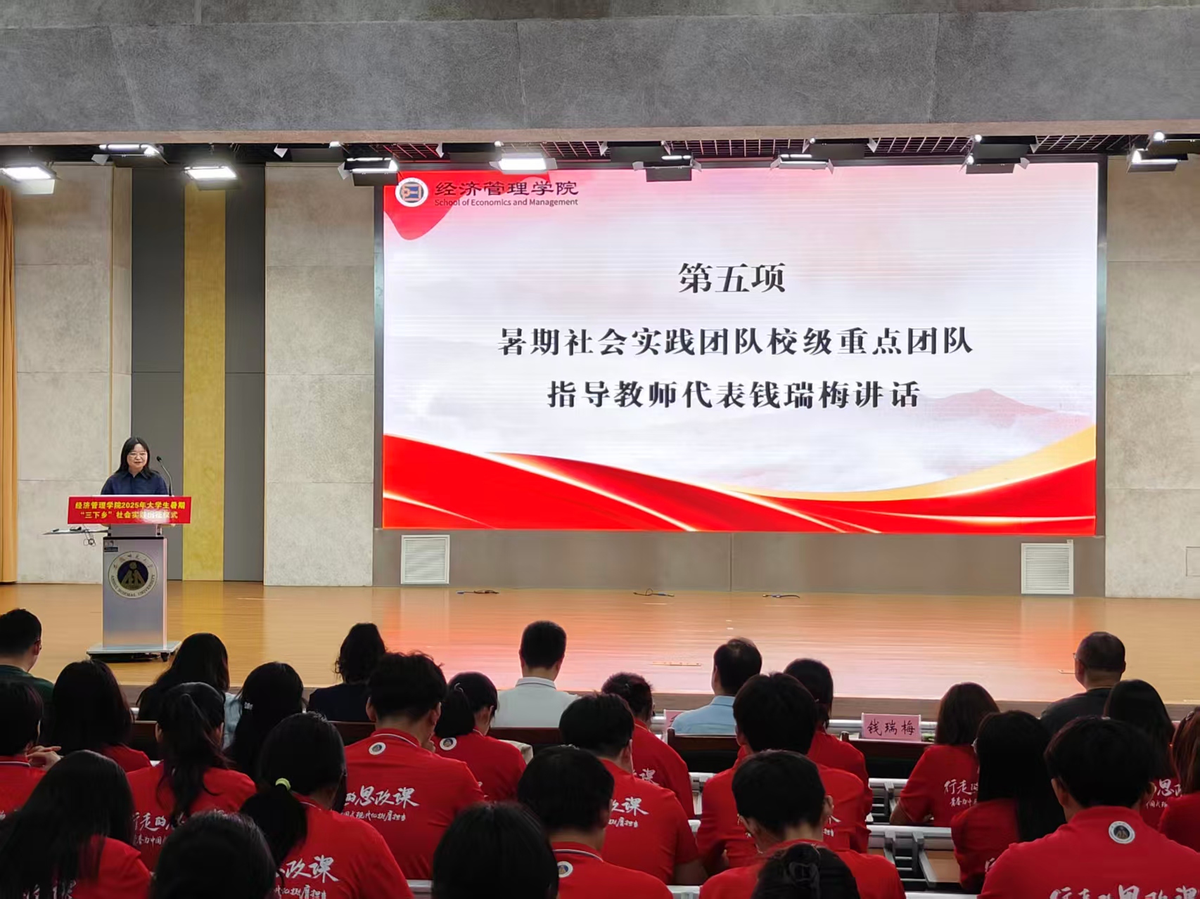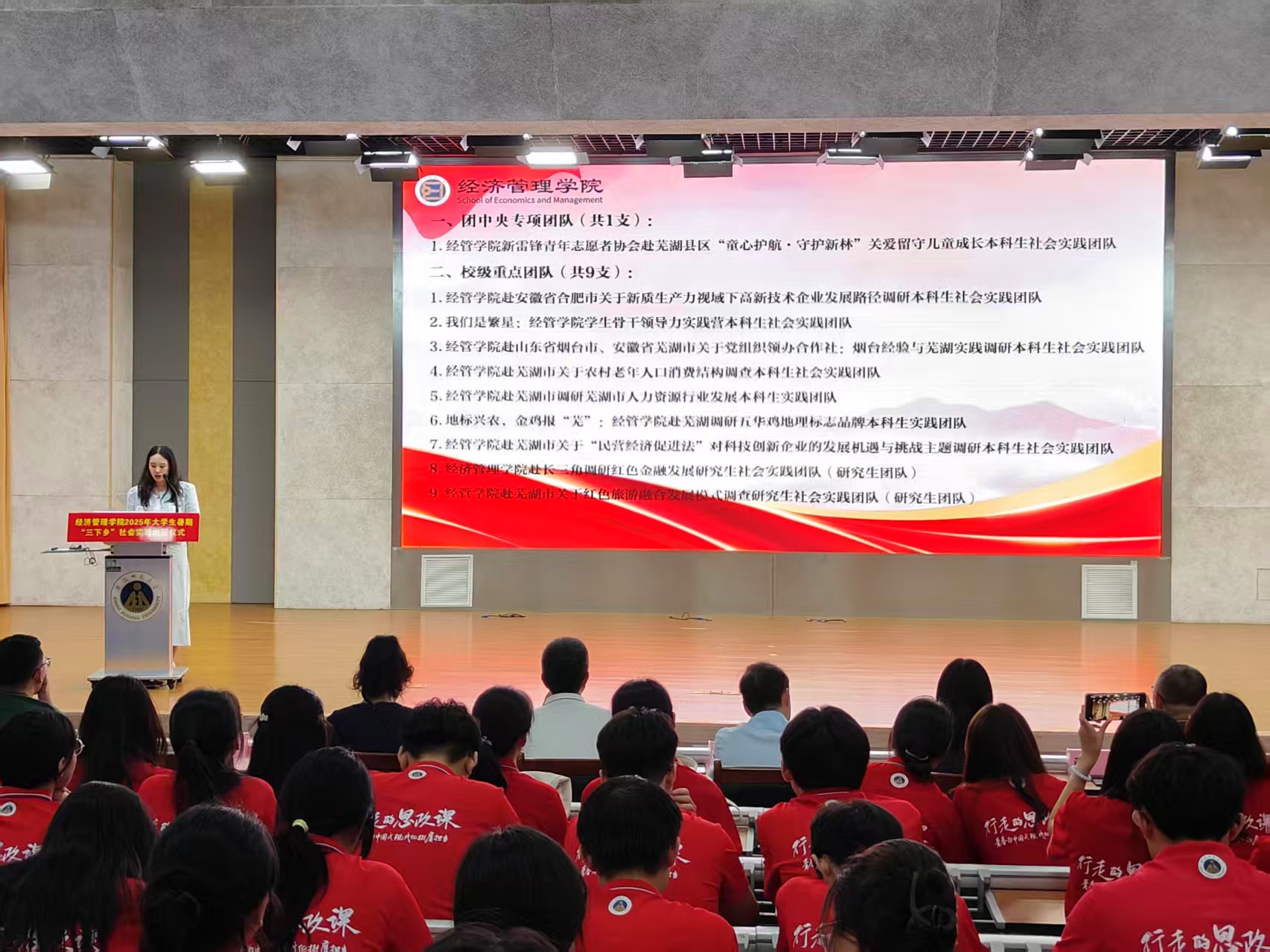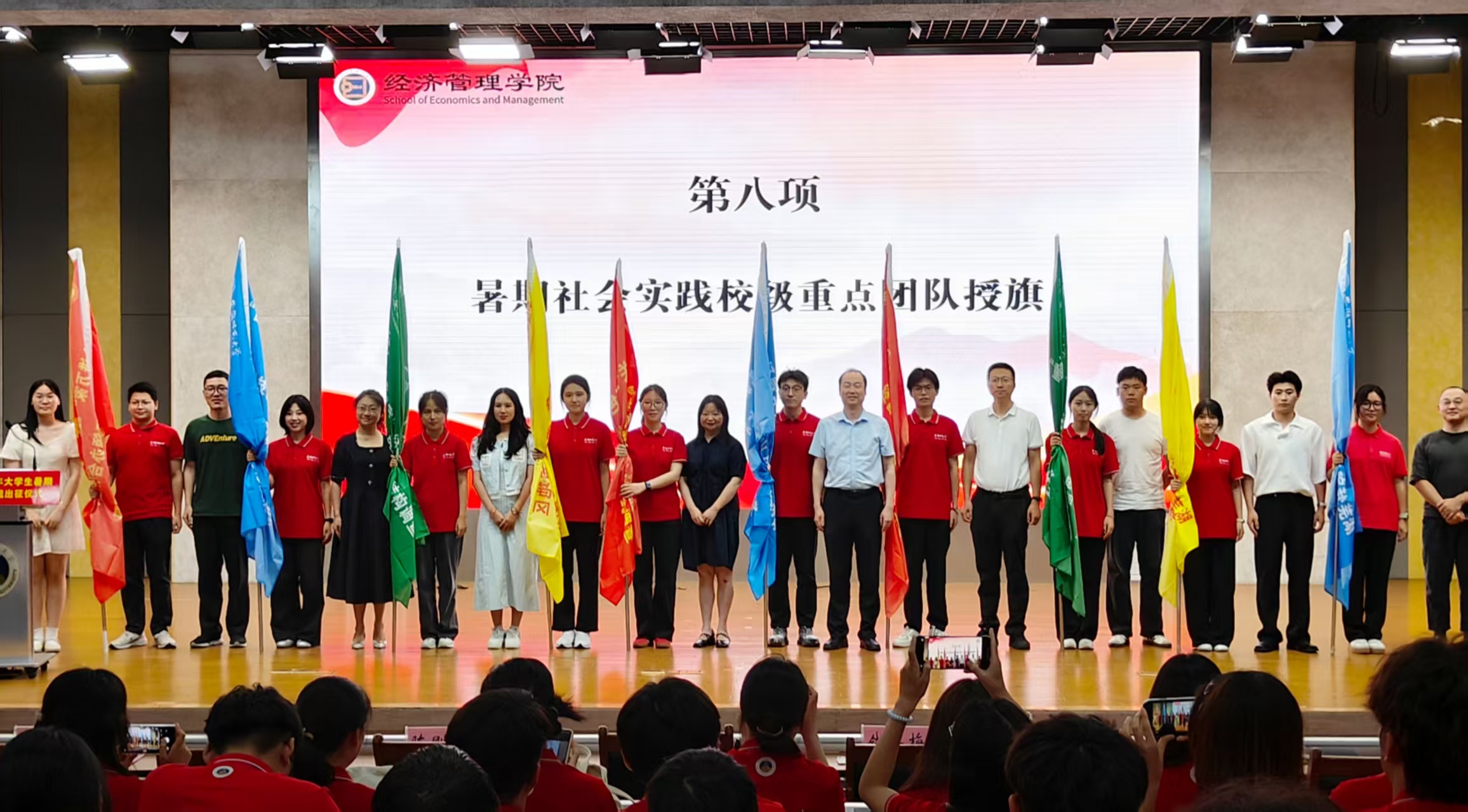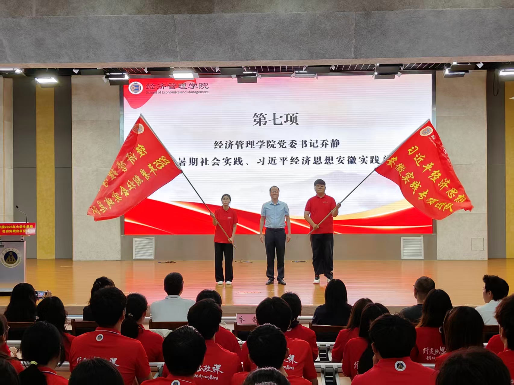 乔静代表公司向公司2025年暑期社会实践总队、“习近平经济思想的安徽实践”总队授旗。随后,领导老师向十支暑期社会实践校级重点团队授旗。
