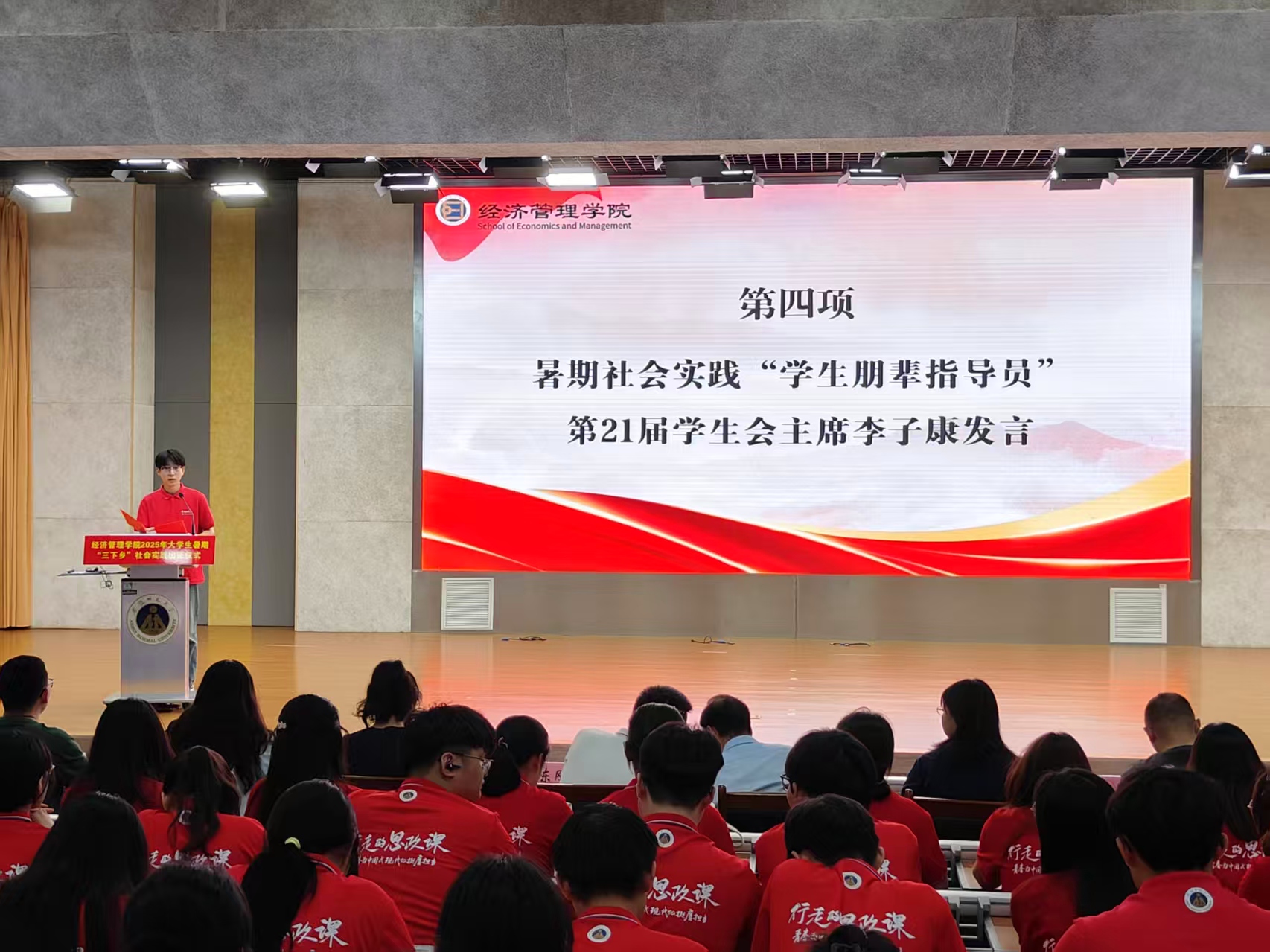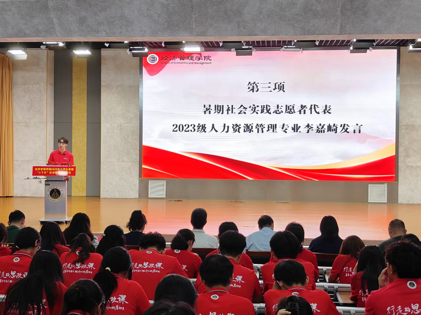 暑期社会实践志愿者代表、2023级人力资源管理专业李嘉崎在发言中表示,作为实践志愿者,自己要用行动践行习近平总书记的殷切嘱托,用脚步丈量祖国大地、用眼睛发现中国精神、用耳朵倾听人民呼声、 用内心感应时代脉搏,在观察和服务社会中彰显人生价值,让青春在泥土里扎根,在基层实践中感悟中国精神、助力乡村振兴,以踔厉奋发的姿态践行青年使命。