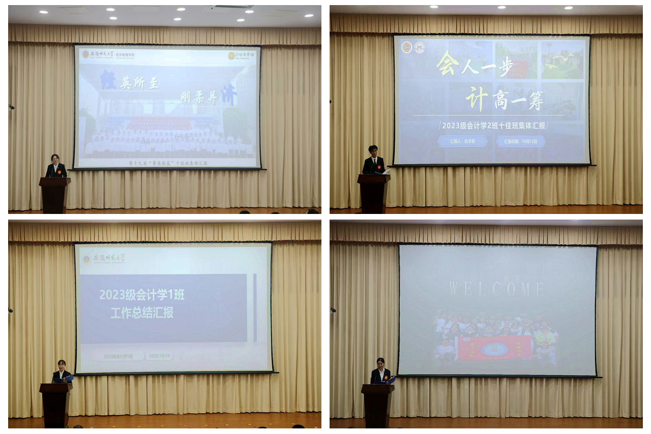 评选汇报会上,17个班级根据抽签顺序结合PPT形式,围绕各自的思想建设、规章制度、班级荣誉、党团建设、社会实践、基础文明、特色活动等方面对上一年来的班级工作进行全面总结。汇报班级全方位展示了经管学子敢于向前的果敢担当、踏踏实实的作风状态,在实践中学习,在奋斗中成长。2022级经济学一班巧用“GDP核算”学科框架,系统呈现班级建设成果,彰显专业与实践的融合智慧。2023级经济学二班以“产品发布会”为创意亮点,将班级建设与经济学“价值理论”深度结合,凸显专业特色与育人目标。2023级会计学二班以荣誉开篇、以“四心四力”为路径,生动诠释优秀集体的凝聚之道与建设成效。其余班级同样各具特色、亮点纷呈,全方位展现了经管班级蓬勃向上的精神风貌与扎实过硬的建设水平。