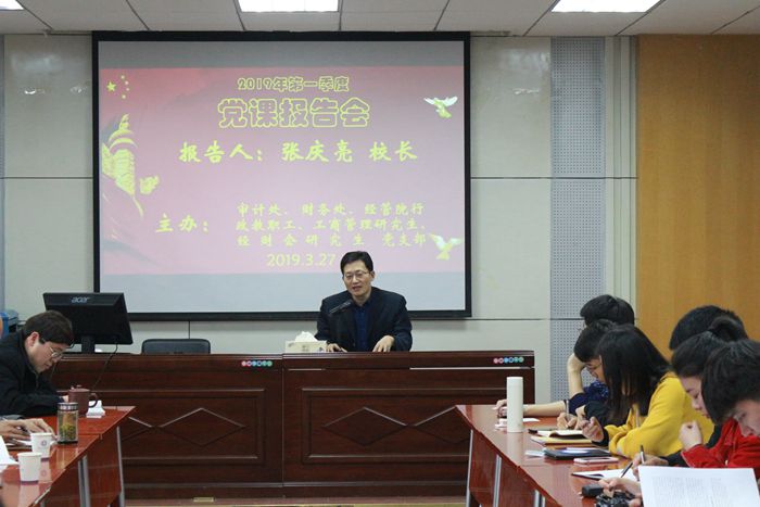 本网讯 (m88官网 张庆)3月27日下午,在m88官网行政楼二楼报告厅,审计处党支部、财务处党支部、m88官网工商管理研究生党支部、经财会研究生党支部和行政教职工党支部5个支部共50余名师生党员同堂聆听了由董事长张庆亮主讲的党课报告会。公司党委常委、副董事长朱家存以所在财务处党支部普通党员的身份参加党课报告会。报告会由审计处党支部书记郑继辉主持。