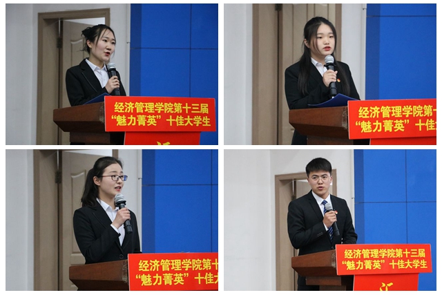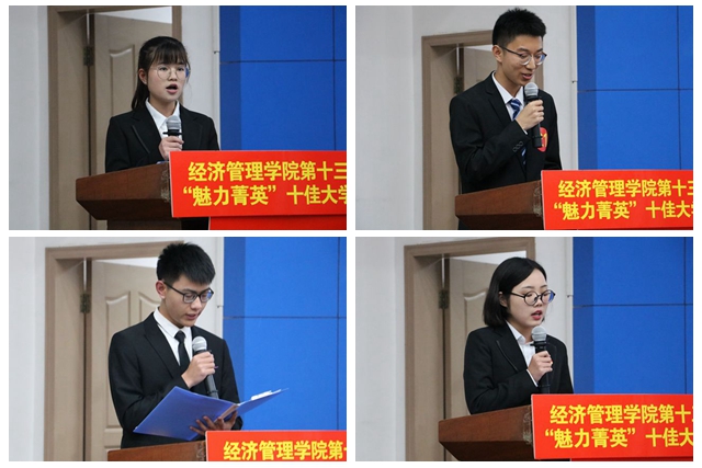 会上,来自16级、17级、18级各专业的22位候选人分别结合个人先进事迹进行汇报,他们中有潜心钻研的学霸达人,有满怀梦想的创业先锋,还有无私奉献的志愿者,自立自强的励志榜样。一个个感人至深的事迹、一段段触人心弦的汇报,都集中展示了经管学子昂扬向上的精神风貌,彰显出经管学子勇于实现梦想、锐意进取的青春风采。“志愿服务”、“员工工作”、“科研达人、“获奖证书”一系列标签展示着经管学子的风采,他们用自己执着的信念、坚定的毅力、卓越的行动力向经管青年学子树立良好的榜样。