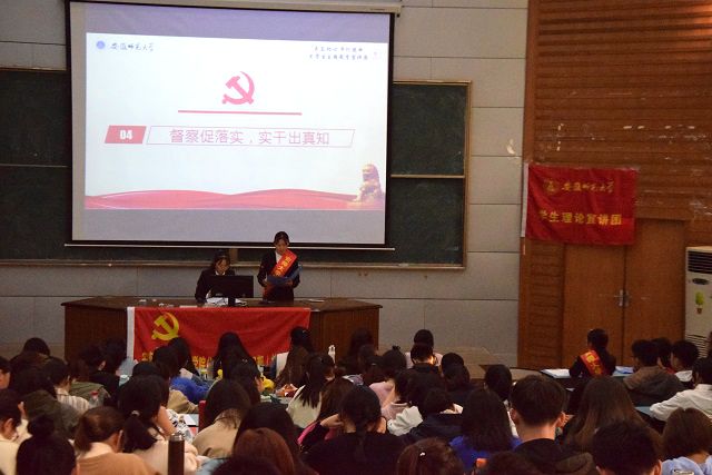 正是因为之前的革命先辈们为了国家的解放和发展舍生取义,为了国家的繁荣和富强奉献自我,才有了祖国今天的山河无恙和国富兵强。现如今的社会比历史上任何时期都更接近、更有信心和能力实现中华民族伟大复兴的目标,但前进道路上绝不是轻轻松松。为此,宣讲团成员分别作了“担复兴重任,当青年责任”、“督查促落实,实干出真知”、“欲行其事,先励其心”的主题报告,鼓励入党积极分子用科学理论武装头脑,真正做到入脑入心;提升品行增强本领,锐意进取真抓实干。宣讲团成员们也强调在前进的道路上,不仅要学习理论知识,在实践中加深对理论知识的理解,还要不断检视自己与优秀党员在理论素养、党性修养、作风涵养、担当作为上的差距,并不断增强“四个意识”、坚定“四个自信”、做到“两个维护”。历史只会眷顾坚定者、奋进者、搏击者,而不会等待犹豫者、懈怠者、畏难者。作为新一代入党积极分子,应该接过中国梦“接力赛”的“关键一棒”,在实现中国梦的伟大实践中放飞青春梦想,为建设社会主义现代化强国奉献自己的力量。