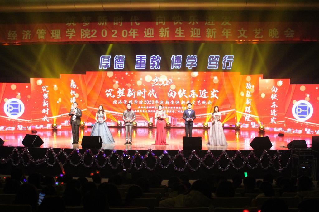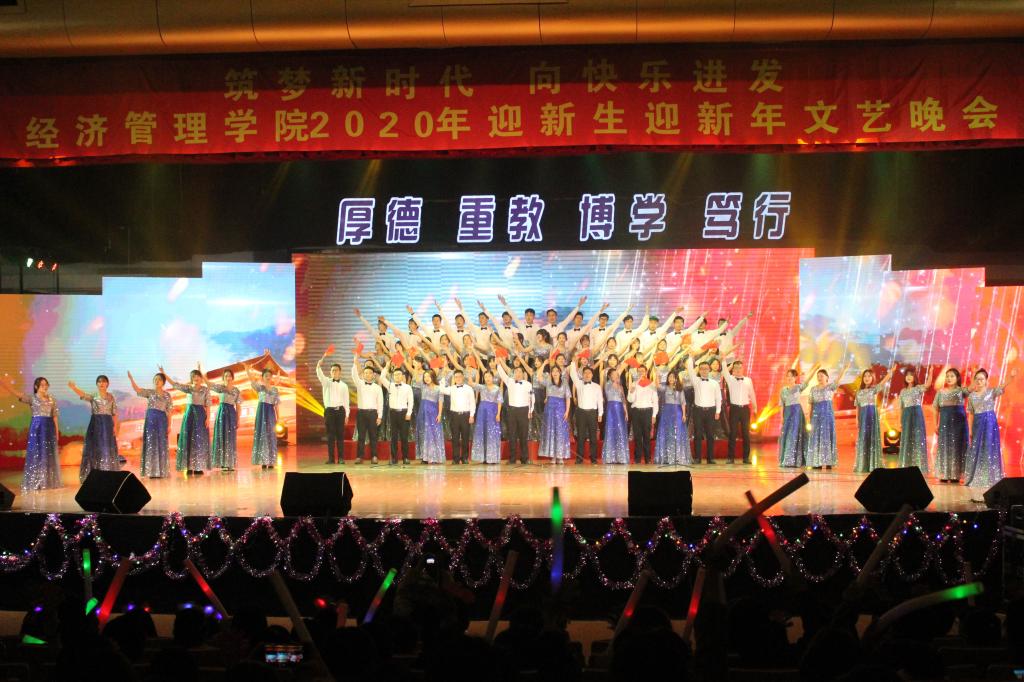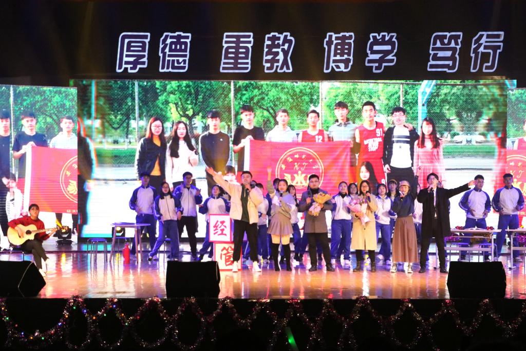 经管礼赞,礼赞着他们,这些用一摞书、一支笔,就在专业知识竞赛场上勇敢角逐,用执着和奋进书写璀璨篇章的经管学子们;礼赞着他们,这些带起优秀的冕冠,为梦想燃烧,为责任勇敢,在赛场、舞台、志愿场地躬行的实践者们。颁奖典礼上,他们用奋斗与汗水书写青春的报告,树立青春的榜样。青春不息,奋斗无悔!唱念做打,窈窕淑女一娉一笑间粉墨登场,身法轻柔,水袖旖旎一放一收里情思万种,笛琴共鸣,《罗袖思》在衣裙蹁跹间敛来了多少脉脉思念。清风一调,花色一朝,峥嵘岁月在歌声里重现,激越时代在曲调中绽放;这盛世,如您所愿,这华夏,万世昌荣,《经彩之声》演绎非凡,欢乐无限,用美妙的歌声描绘青春的色彩。足不出户,阅尽天下事,《经管新闻联播》在端庄的姿态间透露出俏皮的幽默,寝室间因洗衣房发生的“会晤”,员工会查寝“缴收”违规电器,经济学会招得女生一名,解决了男女比例失调的问题处处笑点处处智慧。音符跳动在飘扬的发丝上,节奏拍打在衣角折叠的纹路中,每一次盘旋摩擦,伏地起身都挥发出炽热的温度,当白昼替代夜晚,当快乐替代失意,当热情蔓延下舞台流淌到整个礼堂,这支街舞《水平线》带来的就是青春最明亮的风采。一曲音符,一段舞蹈,二三两情愫,六七许柔情,我们相约赴一场青春的盛宴,奋斗拼搏,不忘传承,继往开来,砥砺前行!