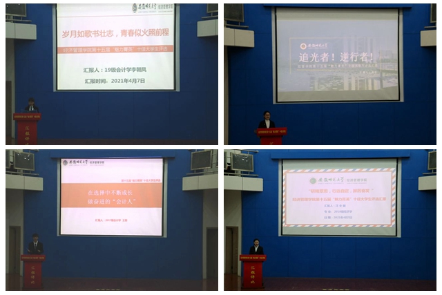 汇报会上,来自各年级各专业的20名候选人通过ppt汇报展示了自己在大学期间学习、科研、社会工作等各个方面取得的成绩,结合自身的成长围绕青春、理想和责任做出了精彩述说,充分展现了经管学子朝气蓬勃、勇于担当、敢于创新的精神面貌和心怀理想、拼搏奋进的胸怀和抱负。一份份上市公司的录用通知,一张张技能考试通过证书,都集中展示了经管学子积极进取的精神风貌。来自2018级经济学的汪全敏同学便把“勤于学习,善于学习”这八个字做到了极致,漂亮的成绩单、一篇篇发表的论文、成为徽商与长三角一体化发展高峰论坛会议中唯一一名汇报论文的本科生;无论是学习还是员工工作,经管学子都尽心尽力,对待工作认真负责,无处不彰显了他们踏实肯干,甘于奉献的工作态度。来自2019级卓越会计ACCA的闫廷钰着重汇报了自己的工作和实践经历,由于对新媒体相关知识的强烈爱好,她在认真细致地完成了院员工会新媒体运营部的工作后还积极进行实践,撰写的公众号文章、原创的抖音视频都拥有着居高不下的流量。